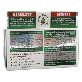 Készítményünk gazdag a prosztata számára jótékony összetevőkben. Tudományos kutatások alátámasztják, hogy: a szabalpálma kivonat elősegítheti a normális vizeletáramlást és a prosztata egészségének megőrzését. A kisvirágú füzike kivonat hozzájárulhat a húgyúti rendszer megfelelő működéséhez. A csalángyökér kivonat hozzájárulhat a prosztata egészségéhez. A cink szerepet játszik a normál termékenység és szaporodás fenntartásában, hozzájárul a vér normál tesztoszteronszintjének fenntartásához. A szelén részt vesz a normál spermaképződésben. Kedvező ár - 2 havi adag - magas ár-érték arány! Adagolás: Felnőtt férfiaknak naponta 1 tablettát bő folyadékkal lenyelni.