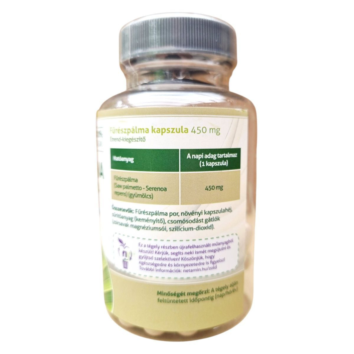 A Netamin Fűrészpálma kapszula 450 mg fűrészpálma gyümölcsport tartalmaz, amelyet növényi kapszulában kínálnak, így a termék 100% vegán. A fűrészpálma hozzájárulhat a prosztata egészségének támogatásához. A termék csomagolása részben újrahasznosított műanyagból készült, így környezetbarát választás lehet. A kapszulák sűrítőanyagként keményítőt, valamint csomósodást gátlóként szilícium-dioxidot és magnézium-sztearátot tartalmaznak. A termék használata során fontos betartani az ajánlott napi mennyiséget, és figyelni a megfelelő tárolási körülményekre.