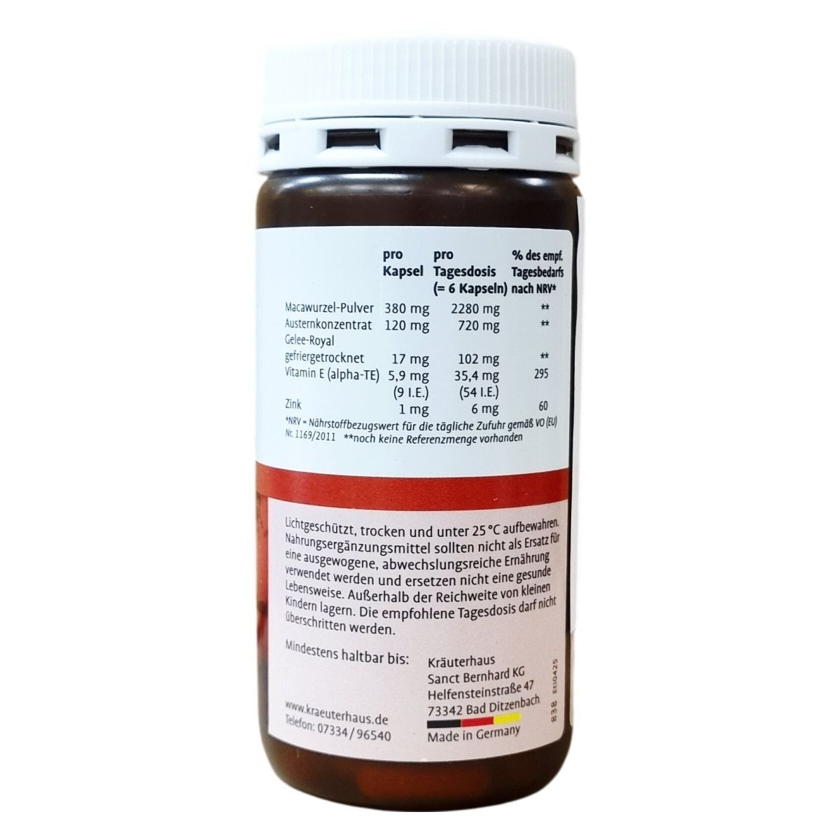 Az osztriga-maca Aktiv-Kapseln kapszula porított maca gyökér porból, osztriga koncentrátumból, zselatinnal bevont kapszulában, valamint szárított méhpempőből, cink-glükonátból és E-vitaminból áll. A készítmény csomósodást gátló anyagot, zsírban oldódó magnéziumsókat is tartalmaz. A terméket Németországban gyártják és főként felnőttek számára ajánlják. Az étrend-kiegészítő adagolása napi 6 kapszula, amely főétkezések előtt bő folyadékkal, egészben lenyelhető. Az ajánlott napi beviteli referenciák közül az E-vitamin 295%-át, a cink 60%-át tartalmazza, míg a maca gyökér, osztriga kivonat és méhpempő esetében nem áll rendelkezésre hivatalos referenciaérték. A termék nem helyettesíti az egészséges és változatos étrendet, valamint egy egészséges életmódot, és gyermekektől elzárva kell tartani.