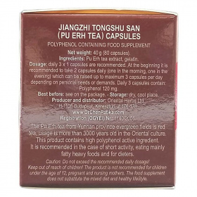 A Pu Erh Tea (vörös tea) előnyeit egyesíti magában a Pu erh kapszula. A kapszula étvágycsökkentő hatású, javítja a zsírok anyagcseréjét, korlátozza a koleszterinszintet, enyhe hashajtó, vízhajtó, gyulladás,- és vérnyomáscsökkentő hatású. A fogyókúra időtartama 30 napos, ajánlatos rövid szünetet tartani a következő kúra előtt. A kúra ideje alatt kerüljük a szeszes italokat és a pikáns, csípős ételeket. A kapszula zsíroldó hatása fokozható, ha több fehérjét és kevesebb zsiradékot, cukrot fogyasztunk.
