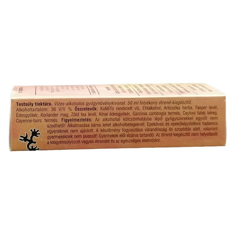 Összetevők: KoMiTo rendezett víz, Etil- alkohol, Zöld tea levél, Egybibés galagonya termés, Kétbibés galagonya virágos hajtásvég, Gyömbér gyökér, Homoktövis termés, Medvehagyma levél, Szurokfű (oregano, vadmajoranna) herba, Réti legyezőfű herba.