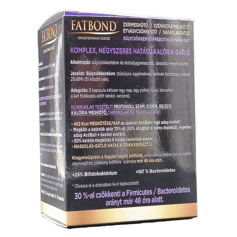 Újra képessé tesz a súlyvesztésre. Klinikailag bizonyított hatás, megoldás ideális testsúlyod eléréséhez és megtartásához. Egy kapszula, amely orvostechnikai eszköz? A Fatbond olyan fogyókúrás innováció, ami rendhagyó módon, több irányból támogatja a fogyást. Bizonyított hatásmechanizmusával tartós megoldást kínál az ideális testsúlyod eléréséhez és megőrzéséhez.