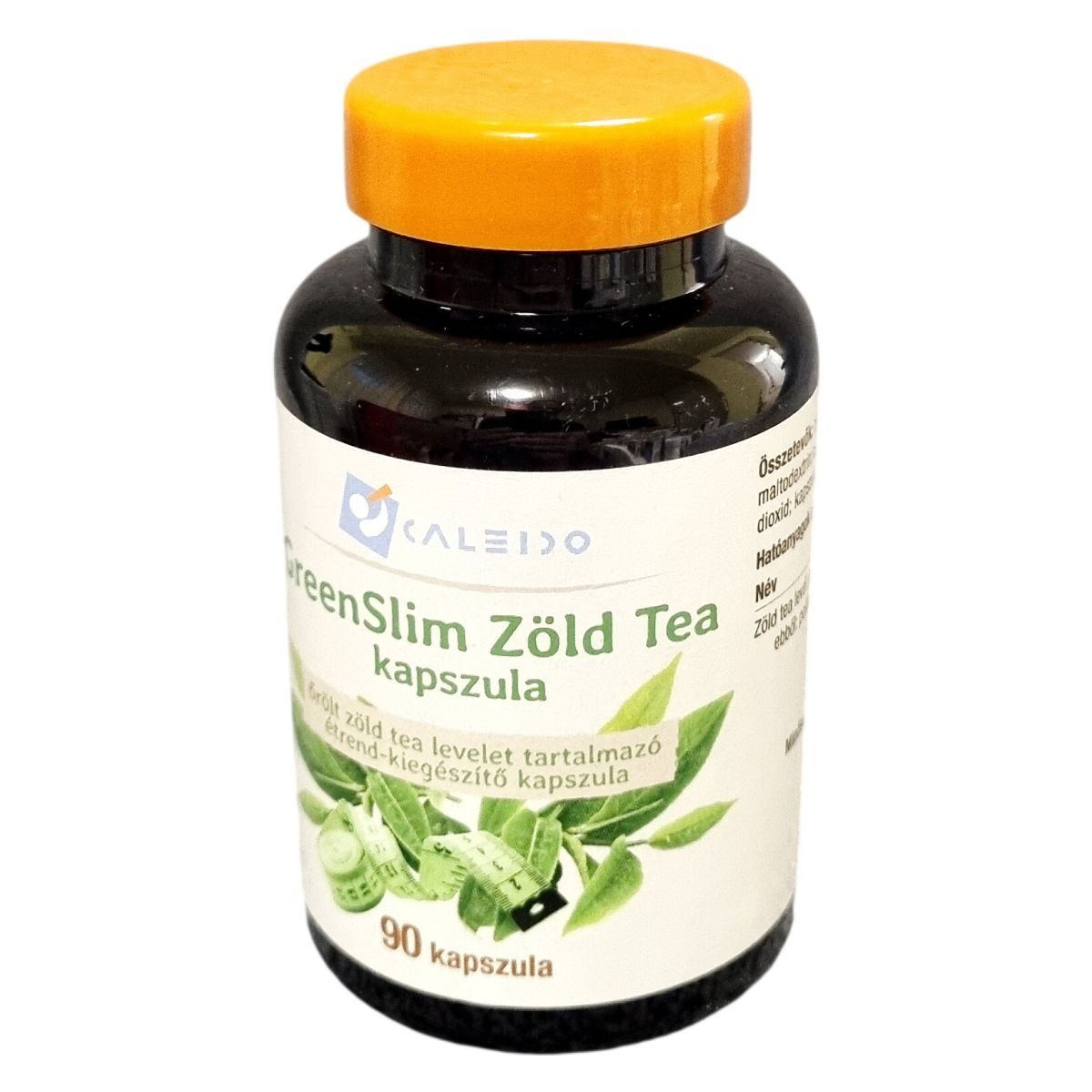 A Caleido GreenSlim zöld tea étrend-kiegészítő kapszula nettó tömege 48,2 g, mely 90 darab, egyenként 536 mg tömegű kapszulát tartalmaz. A termék származási helye Spanyolország. A kapszulahéj szarvasmarha zselatinból készül. Az alkalmazási javaslat szerint a kapszulákat a főétkezések előtt, kb. fél órával kell bevenni, bő vízzel. A termék olyan hatóanyagokat tartalmaz, amelyek támogathatják a szervezet metabolizmusát és a zsíranyagcserét, azonban nem helyettesíthetik az egészséges életmódot és a kiegyensúlyozott táplálkozást.