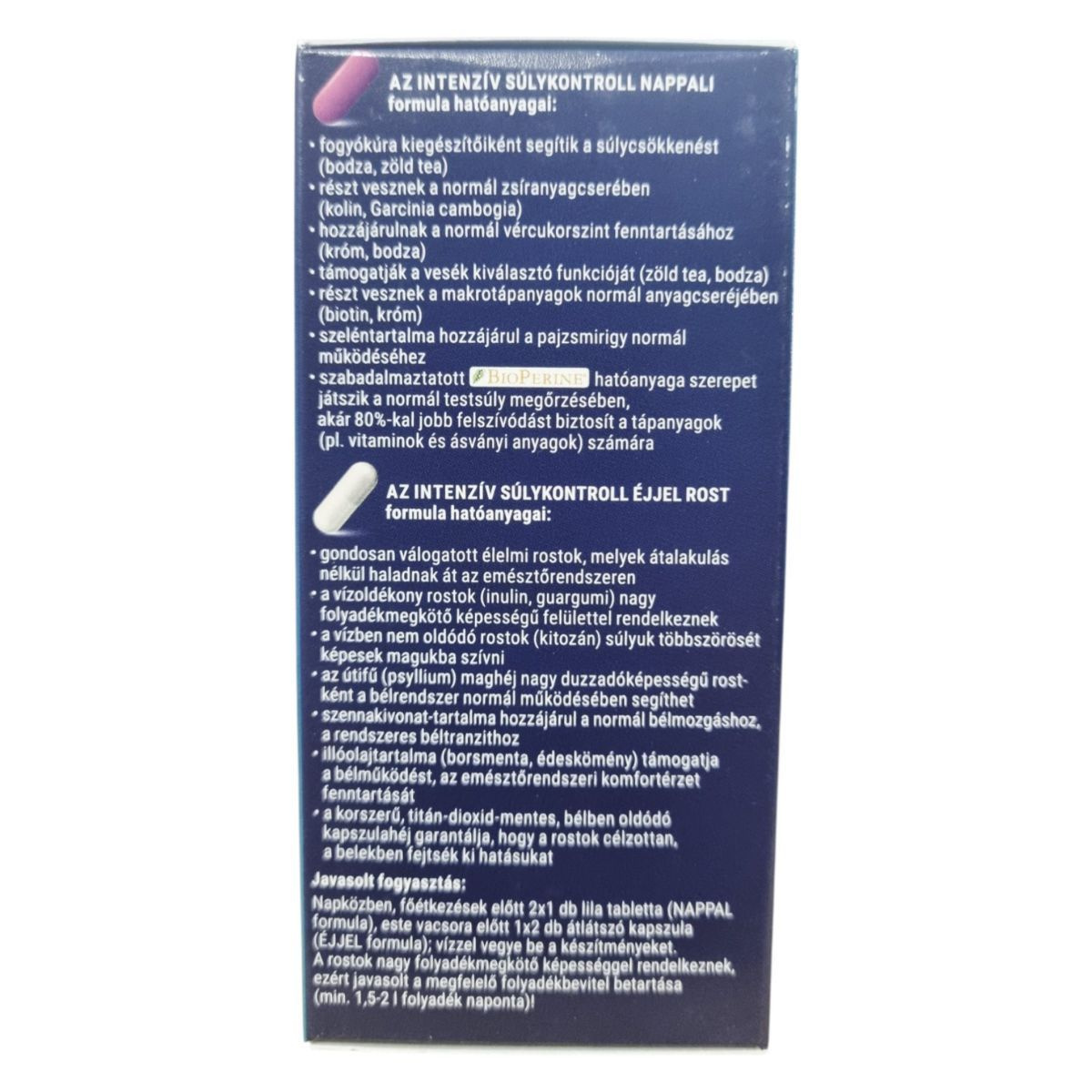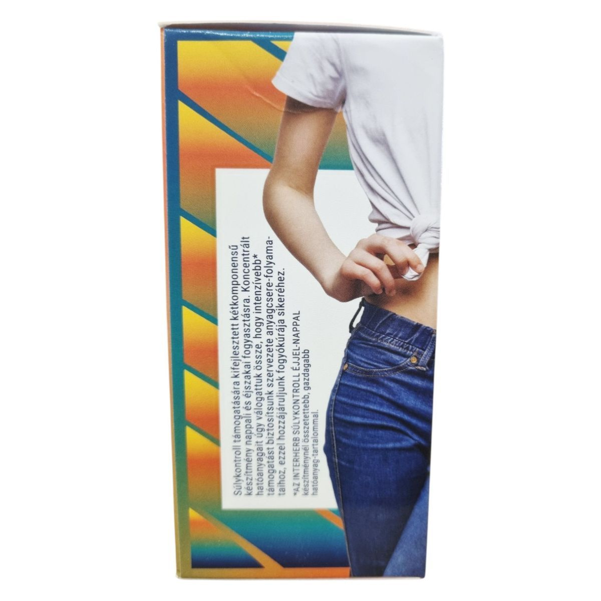Az Interherb Intenzív Súlykontroll Éjjel-Nappal kétfázisú, komplex fogyókúrás készítmény, amely nappali tabletták és éjjeli rost kapszulák kombinációját kínálja. Napközben a bodza, zöld tea, Garcinia cambogia, kolin és króm hozzájárulhat a normál anyagcseréhez, vércukorszinthez és veseműködéshez. Az esti rost formula útifűmaghéjjal, kitozánnal, inulinnal és szennával támogathatja az emésztési komfortot, a rendszeres bélműködést és a testsúlycsökkentő diétát. A BioPerine (feketebors-kivonat) segítheti az egyes tápanyagok felszívódását. A kapszulák és tabletták alkalmazása egyszerű, a napi ajánlott mennyiség betartása mellett a megfelelő folyadékbevitel különösen fontos.
