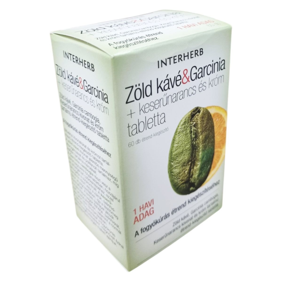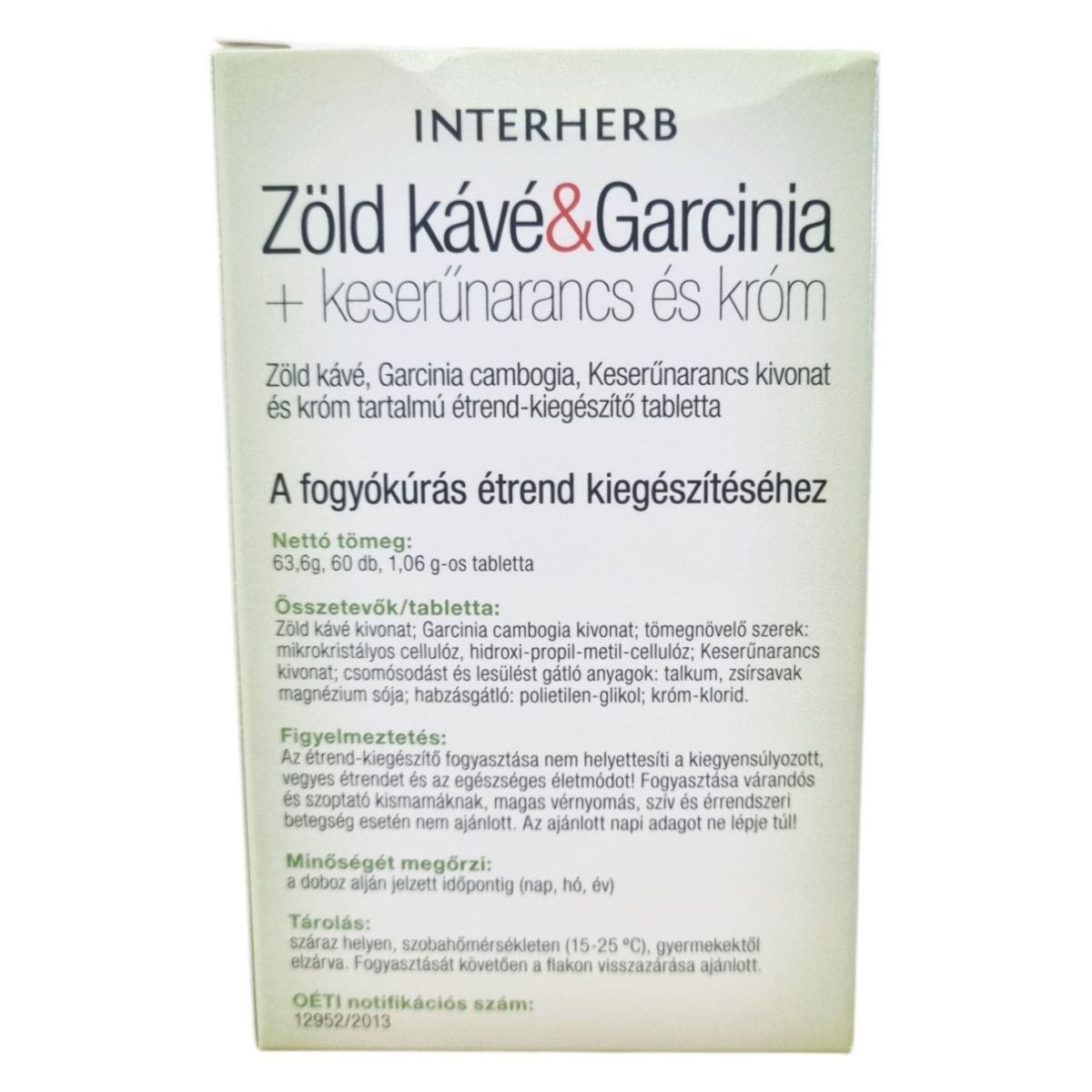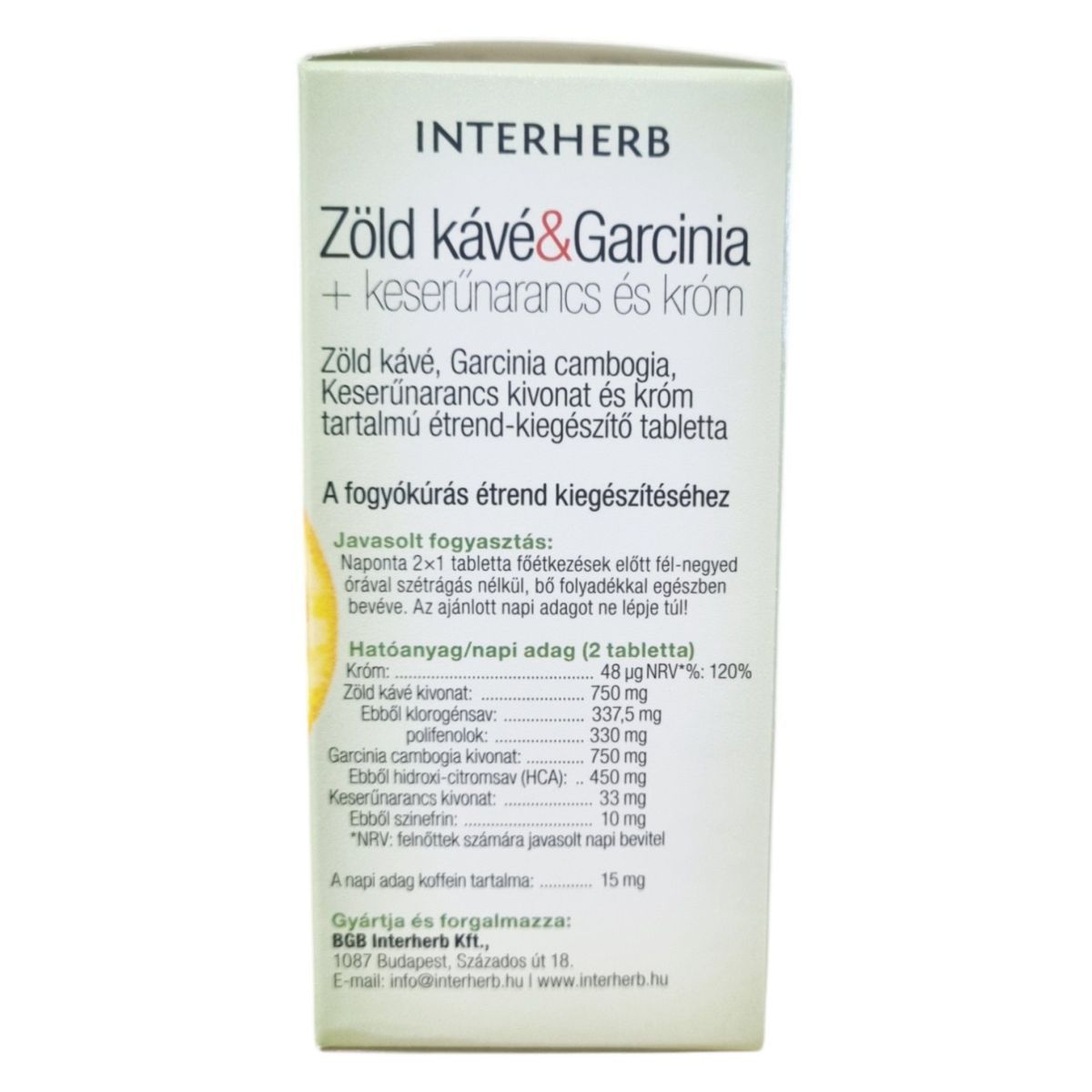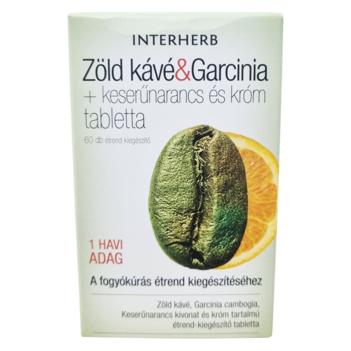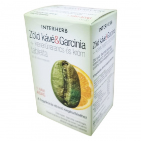 Az INTERHERB Zöld kávé & Garcinia + keserűnarancs és króm tabletta növényi kivonatokat és krómot tartalmazó étrend-kiegészítő, amelyet a fogyókúrás étrend kiegészítéseként ajánlanak. A zöld kávé kivonat jelentős mennyiségű klorogénsavat és polifenolt tartalmaz, míg koffein tartalma mérsékelt. A Garcinia cambogia részt vehet a zsíranyagcsere folyamatokban, hozzájárulhat az éhségérzet csökkentéséhez, ezzel támogathatja a súlykontrollt. A keserűnarancs részt vehet a zsírok, szénhidrátok anyagcseréjében, így segítheti a testsúly kontrollban. A króm szerepet játszhat a makrotápanyagok anyagcseréjében, valamint a normál vércukor szint fenntartásában. A termék fogyasztását a fogyókúrás étrend kiegészítéseként, megfelelő fizikai aktivitás/testmozgás mellett ajánlják.