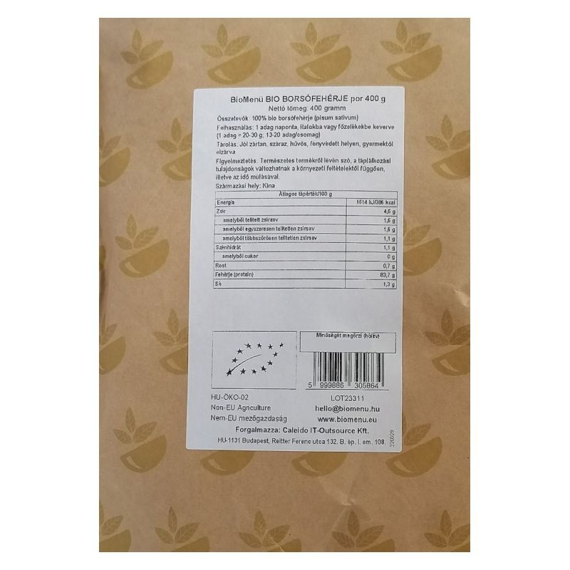 A Biomenü bio borsófehérje port ellenőrzött körülmények között nevelt, válogatott, tisztított borsó felhasználásával készítik. GMO mentes, nem allergizáló és nem tartalmaz nehézfémet, növényvédő szereket, állati eredetű, vagy szennyező anyagokat sem. Alkalmazása: számtalan felhasználási lehetősége van. Elsőrangú eszköze a növényi fehérje szervezetbe juttatásának. Adhatjuk italainkhoz, smoothie-hoz, levesekhez, főzelékekhez és hozzákeverhetjük a bébiételekhez is.