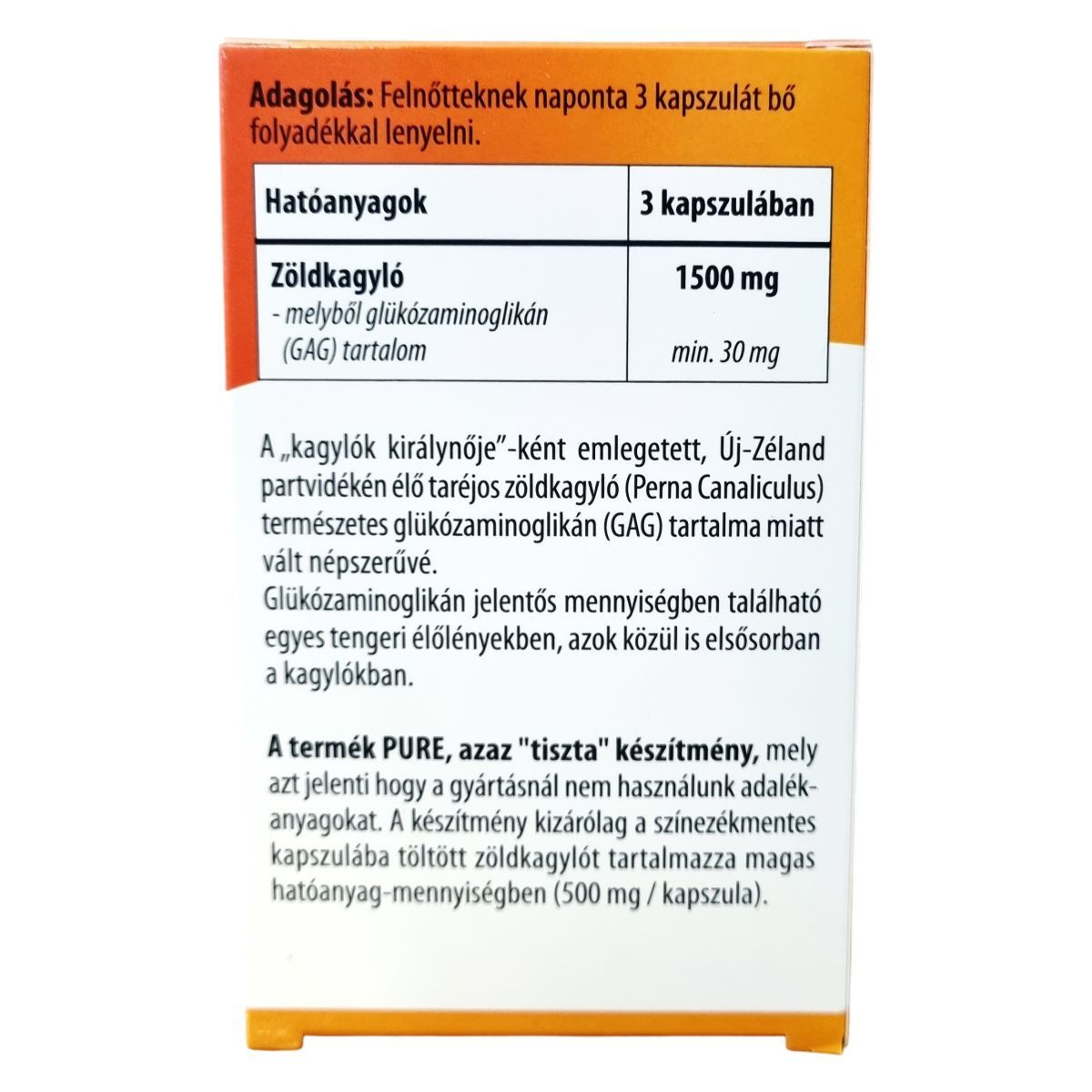 Magas zöldkagyló tartalmú, adalékanyag-mentes étrend-kiegészítő, amely kizárólag tiszta zöldkagylót tartalmaz kapszulánként.