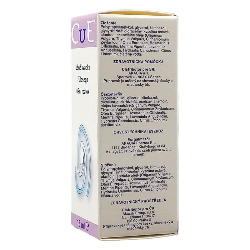 A Cue fülcsepp olyan gombaölő és gyulladáscsökkentő hatóanyagokat tartalmaz, melyek elősegítik a külső hallójárat irritációjával járó elváltozások kezelését.