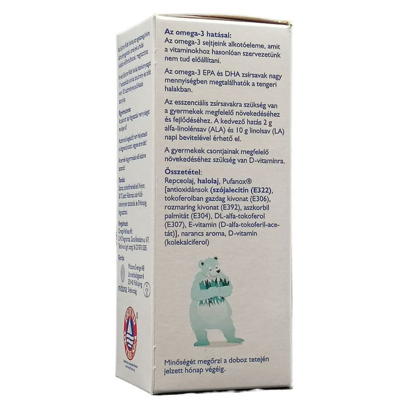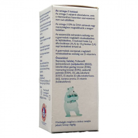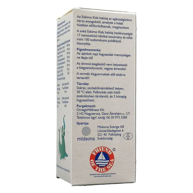 Az Eskimo Kids tisztított, biztonságos halolaj, hatékonyságát és pozitív hatásait 17 nemzetközi klinikai tanulmány bizonyítja. Az Eskimo Kids az egyedüli olyan készítmény a piacon, amelyik több mint 6 hónapig nem avasodik meg! Kiszerelés: 105 ml. Összetétel: Egy teáskanál Eskimo Kids (5 ml / napi mennyiség) esetén: Energia 170kJ (40 kcal), fehérje 0,5 mg, szénhidrát 2 g, zsír 4,60 g, ebből telített zsírsav 0,60 g, egyszeresen telítetlen zsírsav 2,00 g, többszörösen telítetlen zsírsav 1,5 g ebből Omega-6 zsírsav 500 mg,-ebből linolsav 500 mg, Omega-3 zsírsav 600 mg-ebből alfa-linolénsav 230 mg,-EPA 460 mg,-DHA 280mg, Omega-9 zsírsav (olajsav) 1400 mg, E-vitamin 6,7 mg, D-vitamin 5 mikrogramm. Természetes halolaj: Omega-3 EPA és DHA, Omega-6, természetes repce olaj, természetes D és E vitamin, természetes aromák, antioxidánsok: lecitin, aszkorbil-palmitát (A C-vitamin egyik zsírban oldódó változata, mely a legtöbb gyümölcsben és zöldségfélében előfordul). Mennyi a javasolt napi adagja a gyerekkészítménynek? Az Eskimo Kids napi adagja gyermekeknek 2,5 ml-5 ml (1 teáskanál), melyben 5 mikrogramm D vitamin van és ez 200 NE-nek felel meg (NE=Nemzetközi Egység). Ez fedezi a gyermekek D-vitamin szükségletének 50%-át. Mennyi hatóanyag van 1 kanál Eskimo Kids halolajban? Egy kávéskanál Eskimo Kids (2,5 ml / napi mennyiség) 205 mg EPA-t, 140 mg DHA-t, 3,35 mg E-vitamint és 2,5 mcg (mikrogramm) D-vitamint és repce olajat tartalmaz. A napi maximum egy teáskanál Eskimo Kids (5 ml / napi mennyiség) 460 mg EPA-t, 280 mg DHA-t, 6,7 mg E-vitamint és 5 mcg (mikrogramm) D-vitamint és repce olajat tartalmaz.