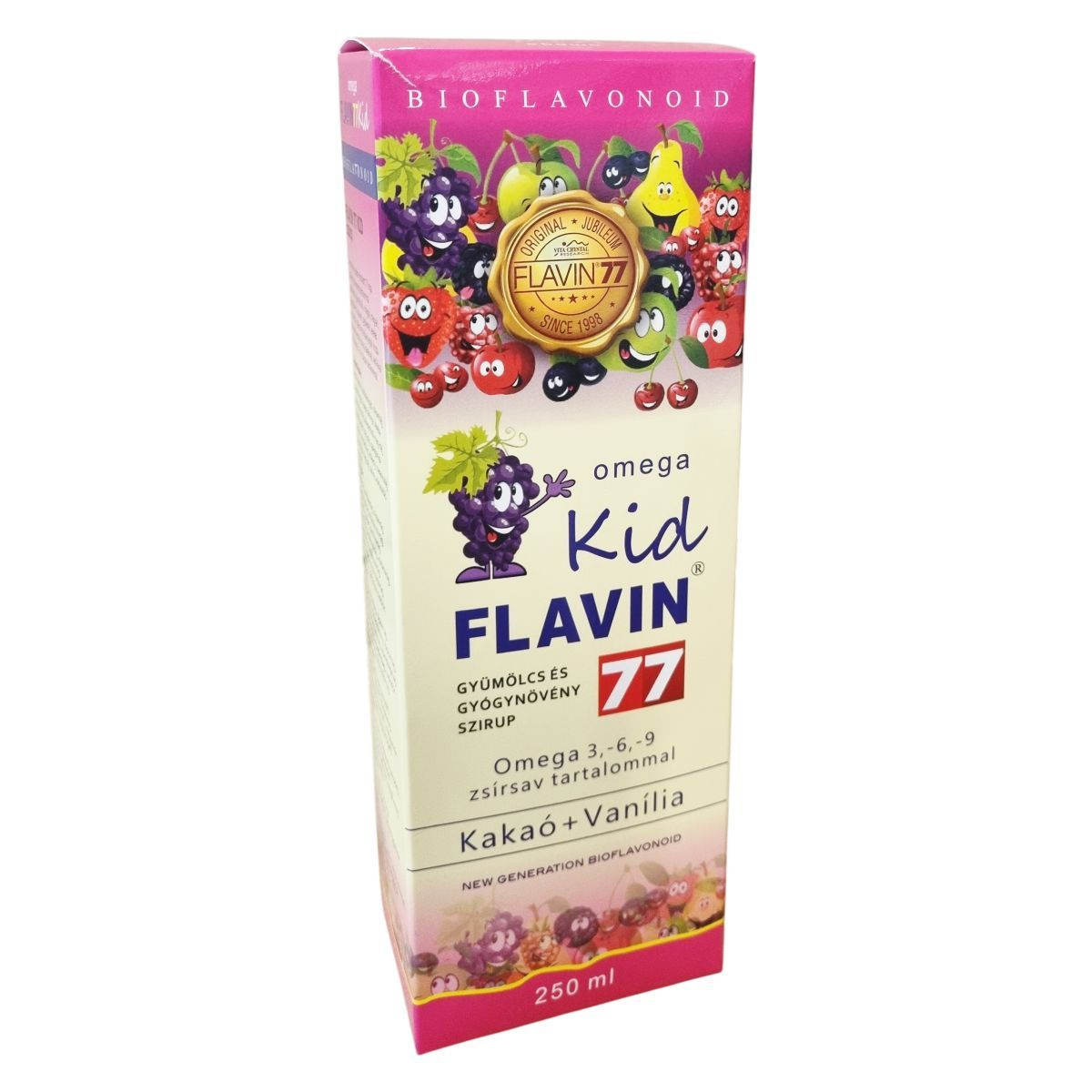 A Flavin 77 Kid szirup gyermekek számára készült különleges termék, amely 77 féle polifenolt és flavonoidot tartalmazó gyümölcsökből, virágokból, magvakból, gyógyfüvekből, fűszerekből, gyökerekből és levelekből álló szárított őrleményekből készül. A gyümölcsök között megtalálható többek között alma, bodza, fekete áfonya, homoktövis és vörösszőlő mag-héj is. A termék kakaóval, vaníliával és Omega 3,-6,-9 zsírsavakkal gazdagított, stevia édesítőszerrel készült szirup. Az összetétel részét képezi továbbá kendermagolaj és természetes aromaanyagok is. Felhívjuk a figyelmet arra, hogy a termék tartósítószert nem tartalmaz, ezért az erjedés elkerülése érdekében a tárolási és fogyasztási előírásokat pontosan be kell tartani. A szirup gyermekbarát ízesítéssel és összetétellel rendelkezik, mely a gyermeki szervezet támogatásában részesülhet.