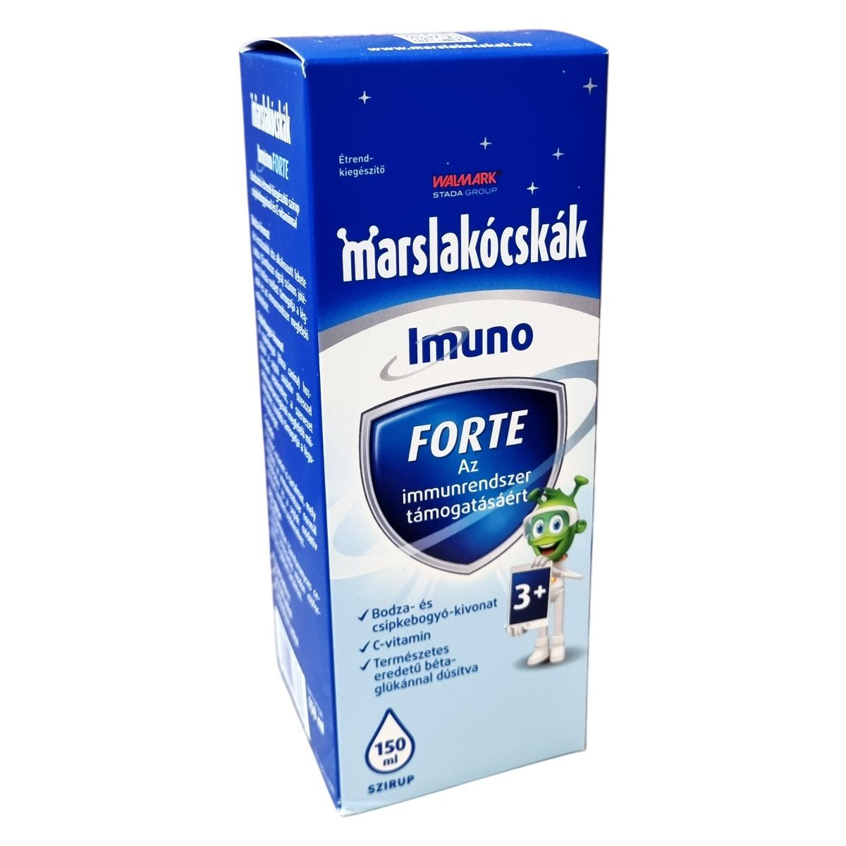 A Marslakócskák® Imuno FORTE bodzaízű étrend-kiegészítő szirup csipkebogyóval, C-vitaminnal és természetes eredetű béta-glükánnal készült, amely az immunrendszer támogatására szolgálhat, különösen gyermekek számára.