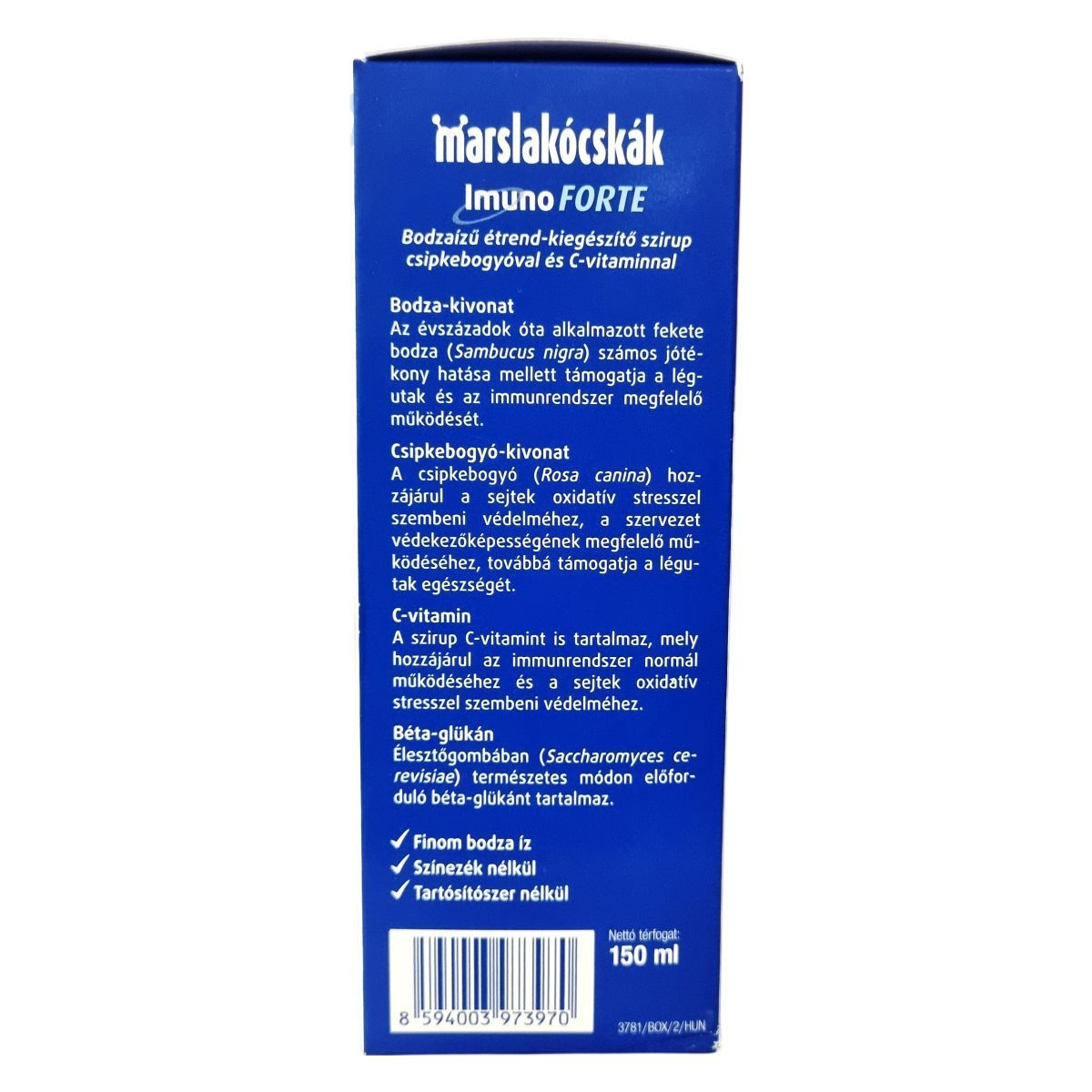 A Marslakócskák® Imuno FORTE bodzaízű étrend-kiegészítő szirup gyógynövény-kivonatokat, C-vitamint és természetes béta-glükánt tartalmaz. A fekete bodza (Sambucus nigra) hagyományos alkalmazása alapján hozzájárulhat a légutak és az immunrendszer megfelelő működéséhez. A csipkebogyó (Rosa canina) a sejtek oxidatív stresszel szembeni védelméhez, a szervezet védekezőképességének megfelelő működéséhez és a légutak egészségéhez támogató lehet. A szirup élesztőgombából származó béta-glükánt is tartalmaz, valamint C-vitamin forrása lehet, amely a normál immunműködéshez és sejtvédelemhez járulhat hozzá. Színezék- és tartósítószer-mentes termék, finom bodza ízzel.