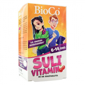 A BioCo SULI vitamin iskolás korú, 6–14 éves gyermekek számára készült, természetes aromával és többféle hatóanyaggal. Tartalmazza a gyermekek szellemi (kognitív) képességeinek fejlődéséhez szükséges vasat, kizárólag szerves vegyületformában. A rágótabletta jelentős mennyiségű D-vitamint biztosít, amely hozzájárulhat a gyermekek immunrendszerének megfelelő működéséhez, csontjaik megfelelő növekedéséhez és fejlődéséhez. A készítmény C-vitamin-, cink-, valamint bioaktív B6- és B12-vitamin-tartalommal egészül ki.
