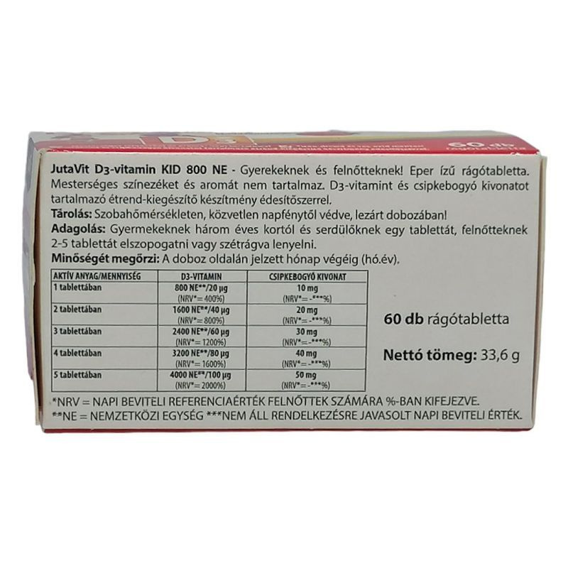 A Jutavit D3-vitamin KID csipkebogyó kivonattal, eper ízű rágótabletta édesítőszerrel.