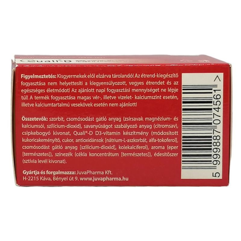 Összetevők: szorbit, csomósodást gátló anyagok (zsírsavak magnéziumsói, szilícium-dioxid, kalcium-sztearát). Savanyúságot szabályzó anyag (citromsav), csipkebogyó kivonat, quali®-d d3-vitamin készítmény (módosított kukoricakeményítő, cukor, antioxidáns [nátrium-l-aszkorbát, alfa-tokoferol], közepes szénláncú zsírsavak trigliceridjei, csomósodást gátló [szilícium-dioxid], kolekalciferol), aroma (eper, [természetes]), édesítőszer (sztívia levél kivonat).
