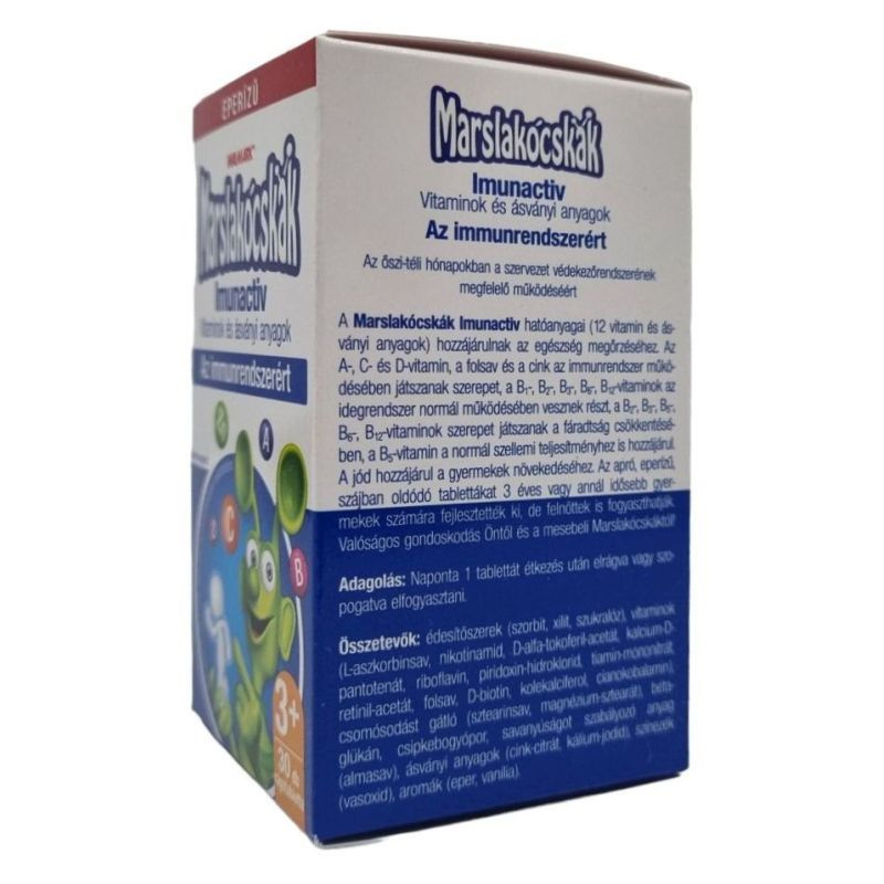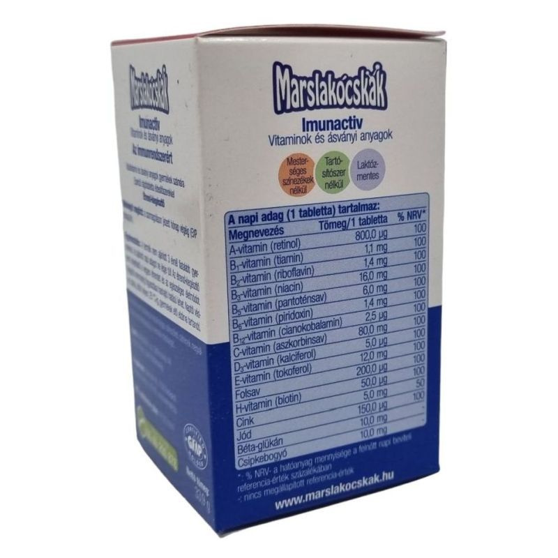 Mindkét ízesítésű Marslakócskák multi vitamin és ásványi anyag tabletta tartalmazza a növekedéshez szükséges vitamin- (A, B1, B2, B3, B5, B6, B12, C, D, E, H, folsav) és ásványi anyag (cink, jód, kalcium) szükségletet. Az apró Marslakócska formájú rágótabletta alakját és ízeit kedvelik a gyerekek. A gyermekek szervezetének fontos 12 vitamint, 4 ásványi anyagot, 1 szabad aminosavat és Béta-glükánt tartalmaz. Marslakócskák Imunactiv tablettában megtalálható a 7 év feletti gyermekek egészséges növekedéséhez és fejlődéséhez szükséges vitaminok ajánlott napi mennyiségének az 50-200 %-a. Fontos összetevője még a Béta-glükán, amely hozzájárul szervezetünk védekező mechanizmusának optimális működéséhez.