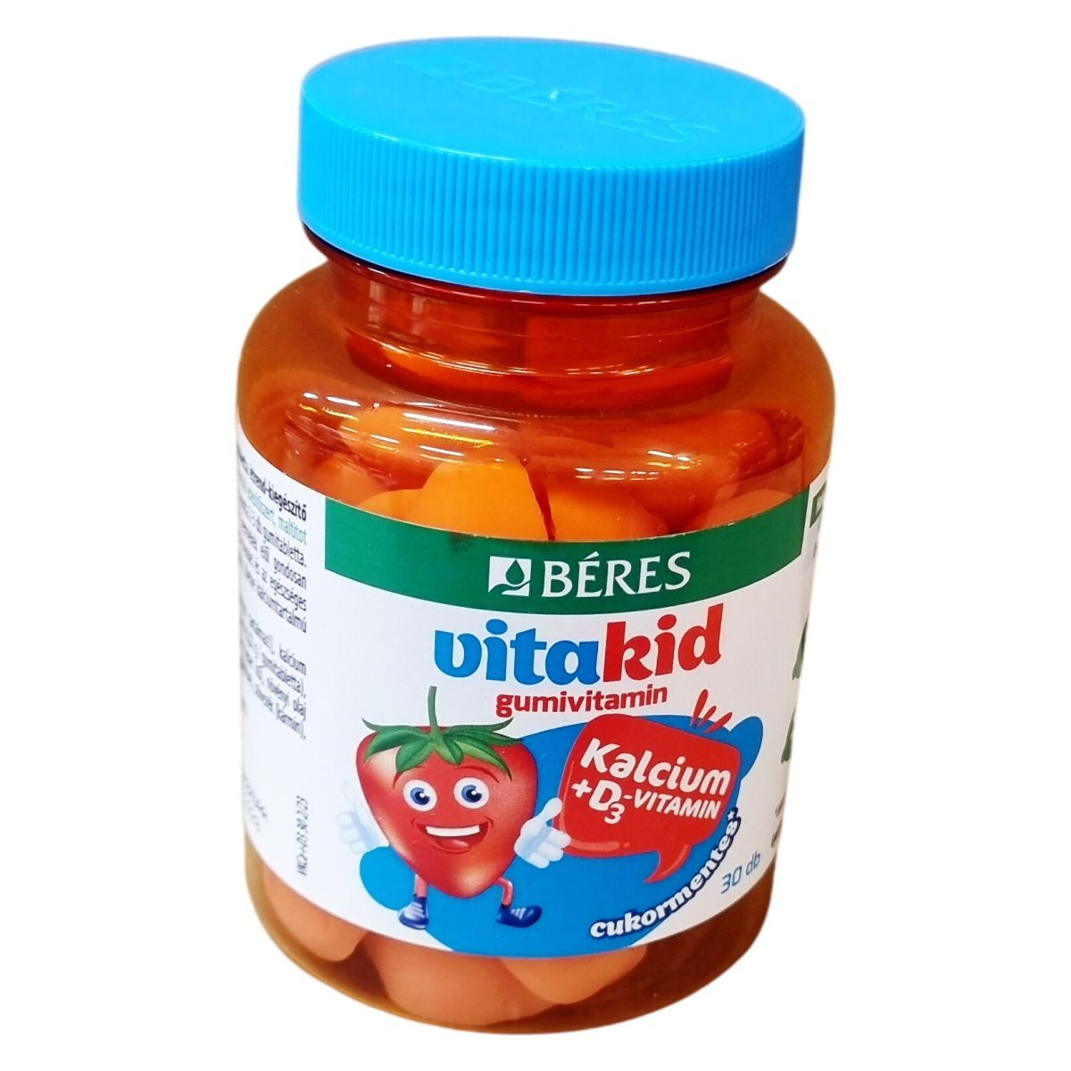 A Béres Vitakid Kalcium+D3-vitamin gumivitamin gyerekek számára készített, cukormentes étrend-kiegészítő, mely eper ízű és édesítőszerként maltitot tartalmaz. Az oligofruktóz élelmi rostként van jelen a készítményben, amely elősegítheti a táplálkozásban a rostbevitel növelését. A termék hozzájárulhat a gyermekek csontjainak megfelelő növekedéséhez és fejlődéséhez a benne található kalcium és D-vitamin révén. A D-vitamin ezenkívül támogathatja a gyermekek immunrendszerének megfelelő működését. A gumitabletták adagolása napi 2-3 darab. A termék összetevői között szerepelnek természetes anyagok, például pálmaolaj vagy kókuszolaj, valamint színezék és aroma is. Fontos, hogy a termék túladagolása esetén hashajtó hatás léphet fel, ezért az ajánlott adagot nem szabad túllépni, és magas kalciumszint vagy kalciumtartalmú gyógyszerek mellett való alkalmazása nem javasolt. A készítményt gyermekek elől elzárva, megfelelő körülmények között kell tárolni.