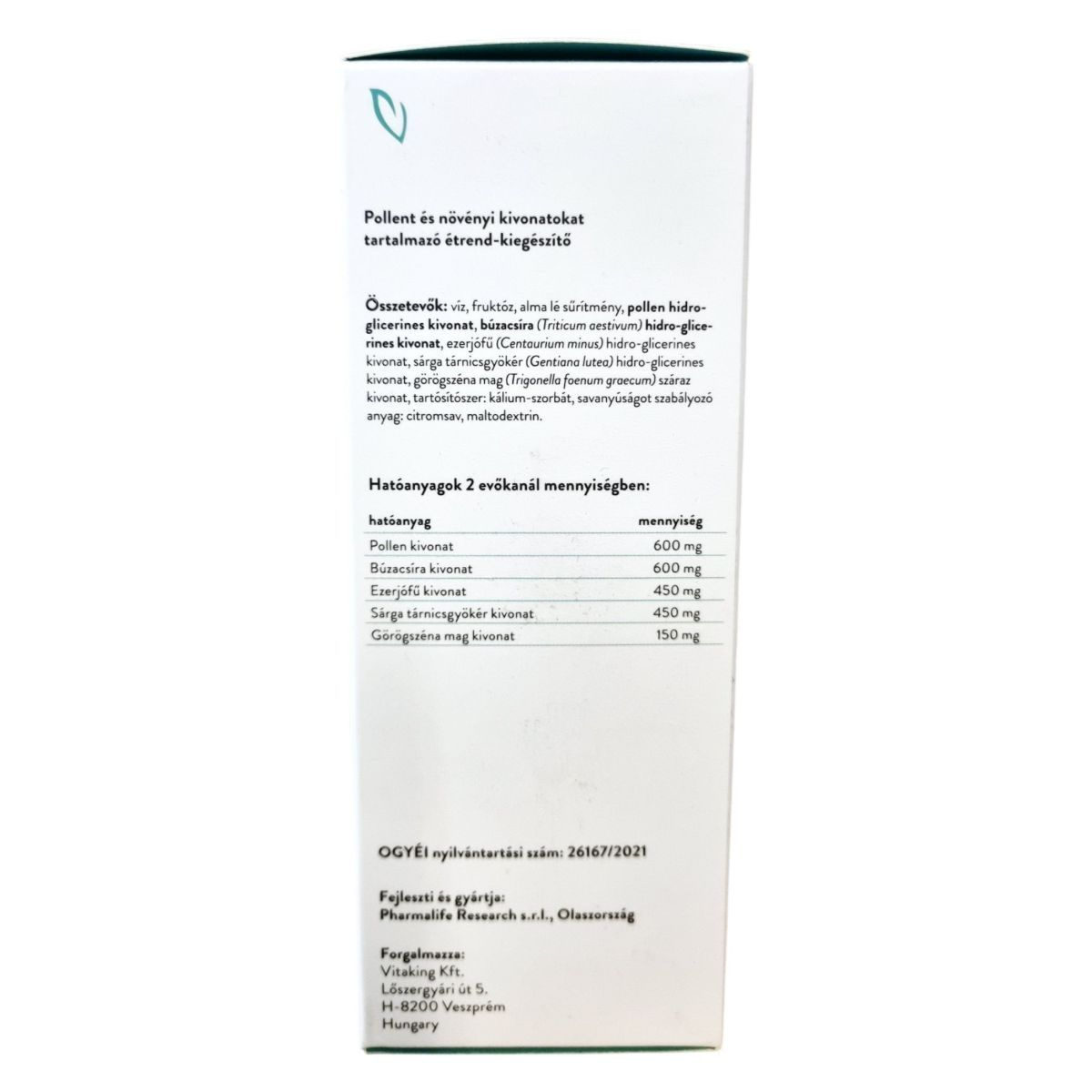 víz, fruktóz, alma lé sűrítmény, pollen hidro-glicerines kivonat, búzacsíra (Triticum aestivum) hidro-glicerines kivonat, ezerjófű (Centaurium minus) hidro-glicerines kivonat, sárga tárnicsgyökér (Gentiana lutea) hidro-glicerines kivonat, görögszéna mag (Trigonella foenum graecum) száraz kivonat, tartósítószer: kálium-szorbát, savanyúságot szabályozó anyag: citromsav, maltodextrin.