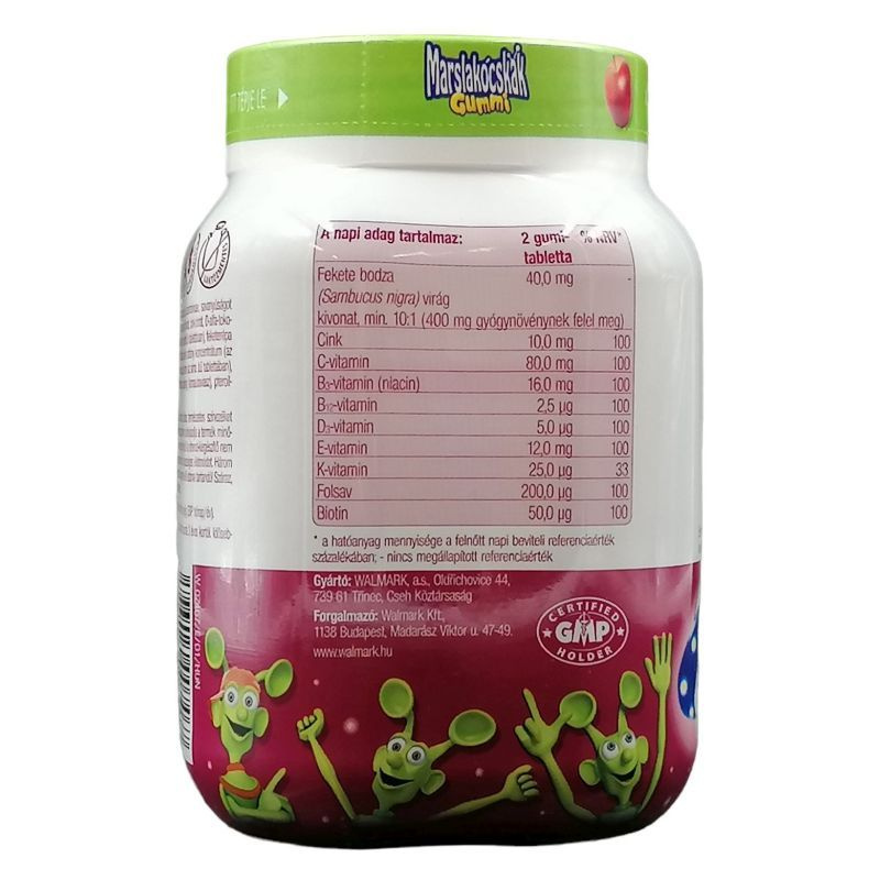 A Marslakócskák Gummi bodzával finom alma és feketeribizli ízű gumitablettái a vitaminok és a cink mellett bodza kivonatot is tartalmaz.