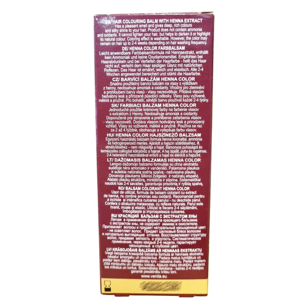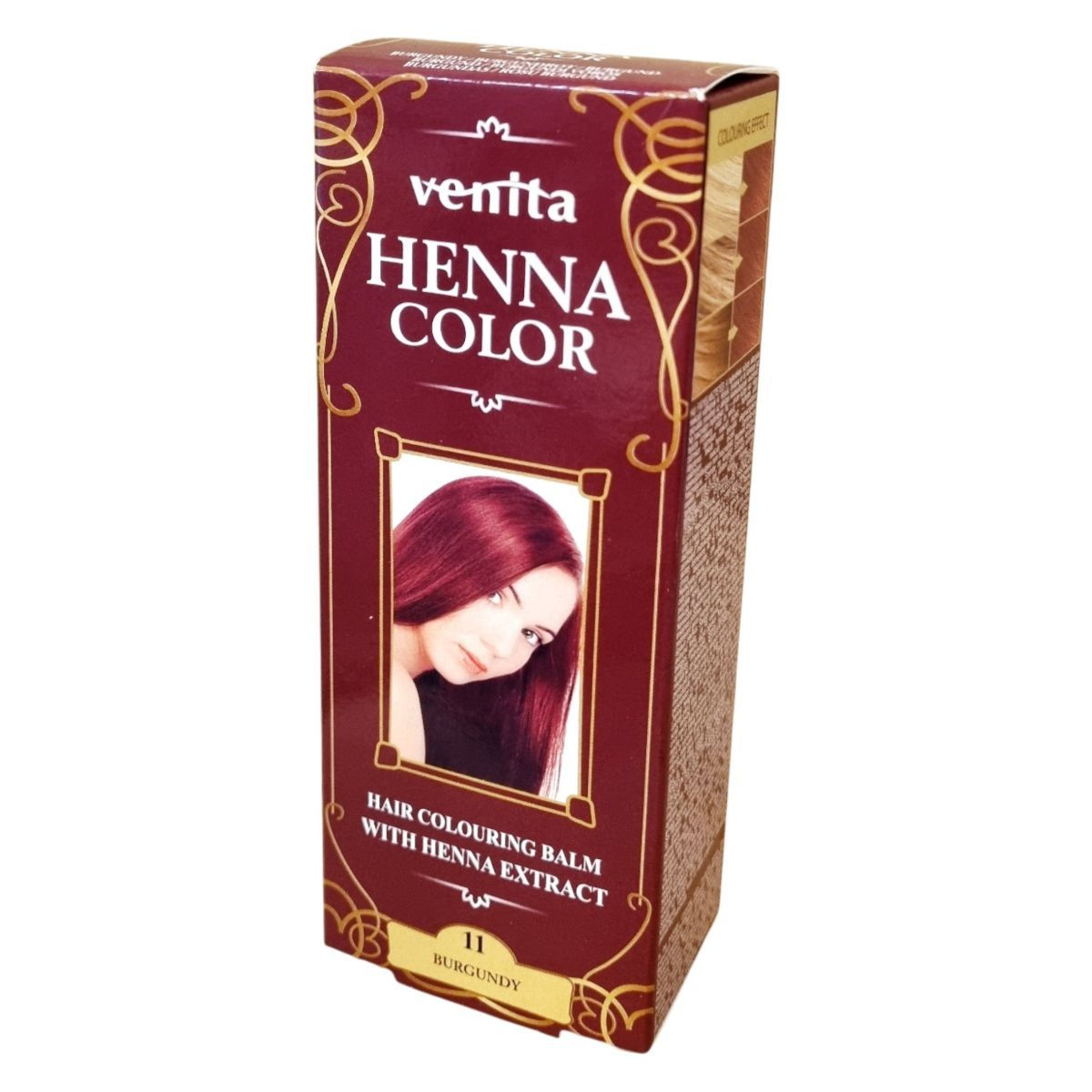 A Venita Henna Color hajszínező balzsam hennakivonattal készült, ammónia- és oxidánsmentes formulával. Használata kellemes illatot, mély és selymes fényt adhat a hajnak. A termék nem világosít, hanem a haj természetes színét mélyítheti vagy kiemelheti. A színezés kimosható, hatása 2–4 hétig tart a hajmosás gyakoriságától függően. Rendszeres használata táplálhatja, erősítheti és ápolhatja a haj szerkezetét, hozzájárulva annak egészséges megjelenéséhez és természetes fényéhez.