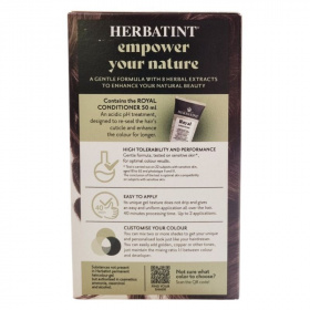 A Herbatint permanent haircolour gel egy gél állagú, csepegésmentes hajfesték, amely egyenletes felvitelt biztosít. A csomag tartalmaz egy 60 ml-es hajfestéket, egy 60 ml-es előhívót, egy 50 ml-es Royal Conditioner kondicionálót és egy pár kesztyűt. A Royal Conditioner savas pH-jú kezelés, amely segít a haj kutikulájának visszazárásában és a szín tartósságának növelésében. A feldolgozási idő 40 perc, a termék akár két alkalommal is felhasználható.