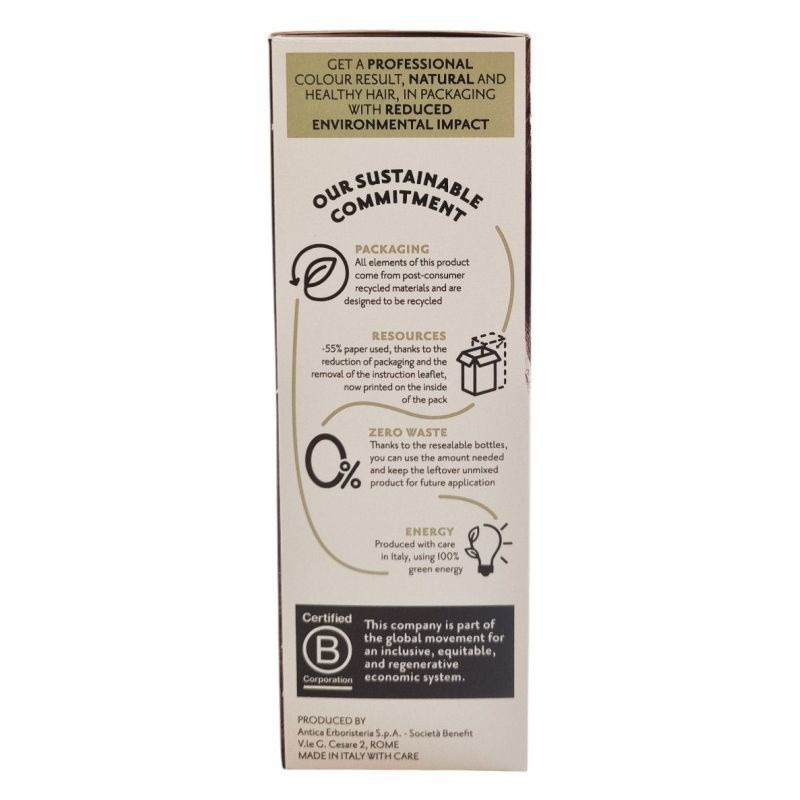 A csomagolás újrahasznosított anyagokból készül, csökkentett papírfelhasználással. Újrazárható flakonjai lehetővé teszik a maradék, nem összekevert termék későbbi felhasználását. Olaszországban gyártva, 100% zöld energiával.