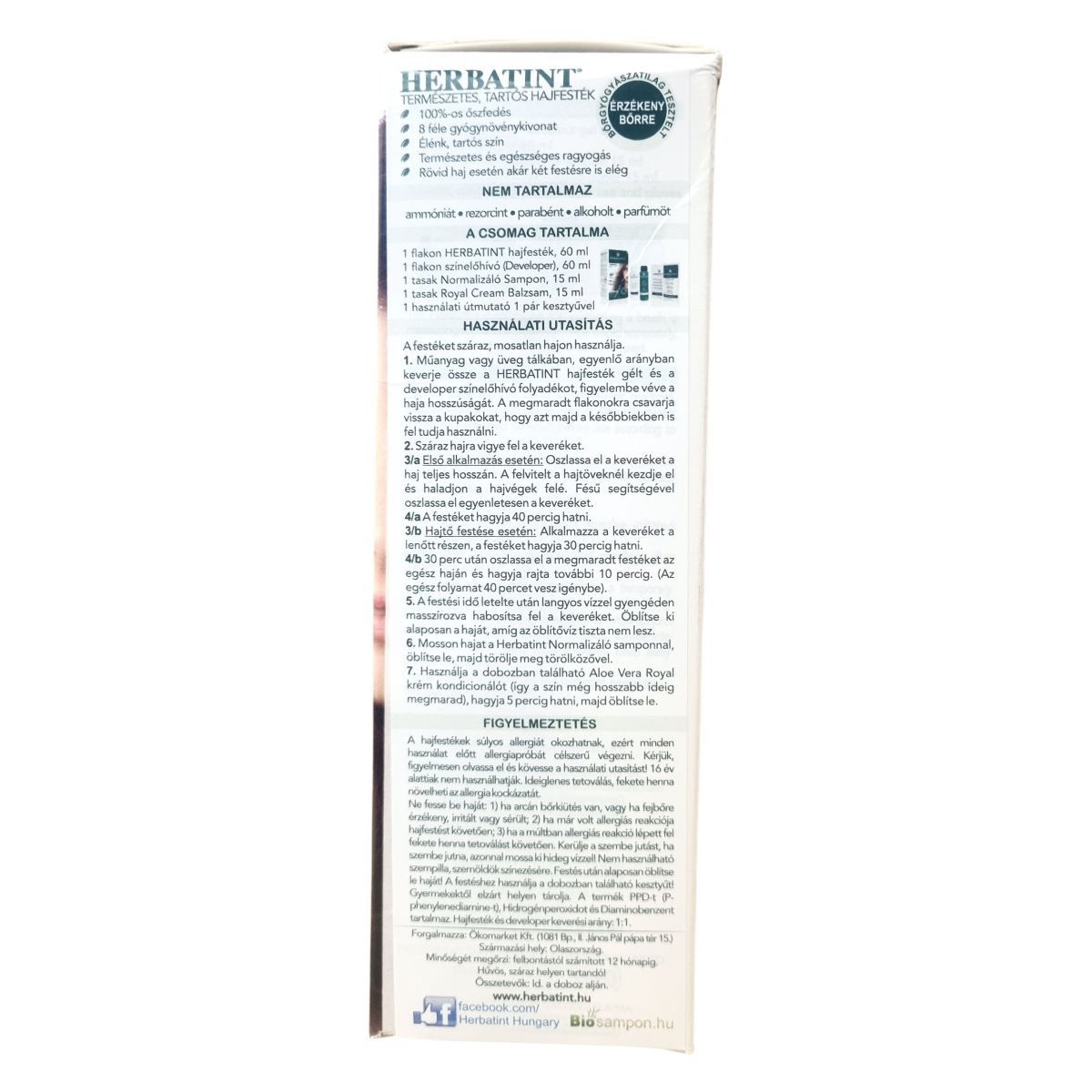 A HERBATINT permanens hajfesték gél egy kíméletes, természetes alapú formula, amely 100%-os őszfedést biztosít első alkalommal is. A 8 válogatott gyógynövénykivonat ápolja és védi a hajat és a fejbőrt, táplálva és fokozva a hajszín intenzitását. A termék ammóniamentes, parabénmentes, alkohol- és illatanyagmentes, így érzékeny bőrűek számára is megfelelő. A csomag tartalmaz egy 60 ml hajfesték gélt, 60 ml színélhívó folyadékot, 15 ml Normalizáló sampont, 15 ml Aloe Vera Royal krém balzsamot, kesztyűt és használati útmutatót. A hajfesték keverési aránya 1:1 a developerrel. A termék akár két alkalomra is elegendő rövid haj esetén, a maradékot visszazárva tárolhatjuk további használatra. Az élénk és tartós színt egyedivé tehetjük a 36 különböző árnyalatból választva vagy azokat keverve. A HERBATINT a természetességet és a haj egészségét helyezi előtérbe, elősegítve a fényes, egészséges megjelenést, miközben környezetbarát csomagolásban érkezik, támogatva az állatkísérlet-mentességet és a fenntartható erdőgazdálkodást.