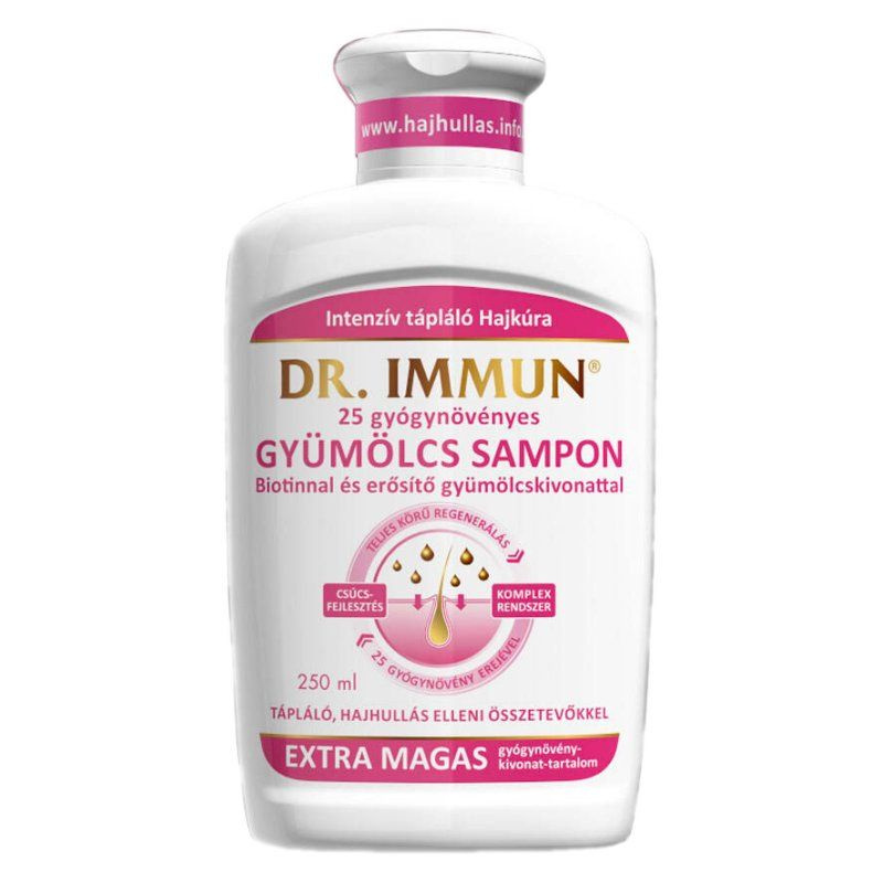 Dr. Immun gyümölcs hajsampon hajhullás, korpásodás elleni összetevőkkel, Biotinnal, 7 gyümölcs és 25 gyógynövény kivonatával. A sampon hajtápláló, hajregeneráló. Férfiaknak és nőknek egyaránt ajánlott.