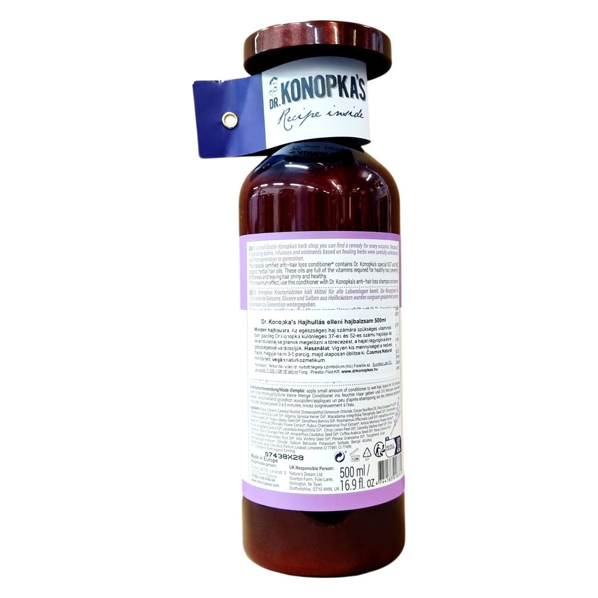 A Dr. Konopka's hajhullás elleni balzsam egy természetes natúrkozmetikum, amely recept alapján készült, és generációról generációra öröklődő gyógynövényes formulán alapul. A készítmény fő hatóanyagai az N37 és N52 számú organikus gyógynövényolajok, valamint organikus levendulaolaj, melyek vitaminokban gazdag összetételükkel erősítik a hajszálakat, csökkentik a töredezést, és egészséges, fényes kinézetet biztosítanak. A termék minden hajtípus számára alkalmas, és maximális hatás érhető el vele, ha Dr. Konopka's hajhullás elleni samponnal együtt használják. Kiszerelése 500 ml, újrahasznosítható PET csomagolásban kapható. Az alkalmazás egyszerű: a nedves hajra kevés balzsamot kell felvinni, 3-5 percig hatni hagyni, majd alaposan leöblíteni. A termék vegán és megfelel a Cosmos Natural minősítés szigorú követelményeinek.