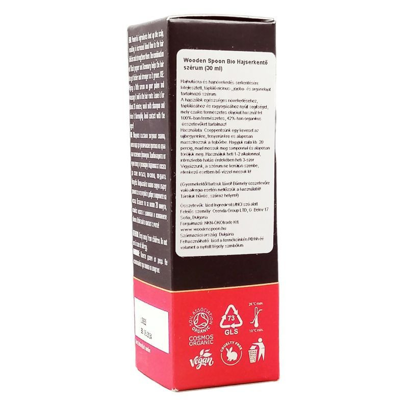 A hajszálak egészséges növekedéséhez, táplálásához és ragyogásához nyújt segítséget a Wooden Spoon hajserkentő széruma, mely csakis természetes olajokat használ fel. Főbb összetevői: a ricinusolaj (kasztorolaj) a mintegy 90%-ban ricinolsavat tartalmaz, a legjobb természetes hajnövekedés-serkentő, emellett segít helyreállítani a haj egészségét, fényét és rugalmasságát. Az argánolaj az egyik legjobb és legsokoldalúbb bőr- és hajápoló olaj, mely gazdag telítetlen zsírsavakban (Omega 3 és Omega 6), természetes antioxidánsokban, polifenolokban, öregedésgátló E- és F-vitaminokban, tripertén alkoholokban, szterolokban, carotenoidokban, xantofillokban, trigliceridekben, stb. Ragyogóvá, élettelivé, dússá és ellenállhatatlanul puhává teszi a hajat. A jojobaolaj jódban, zsírsavakban, C-, E-, és B-vitaminokban gazdag, magas a réz-, a cink-, a króm- és a szilikontartalma. Kémiai összetétele szinte teljesen azonos az emberi bőr által termelt faggyúéval, ezért könnyen felszívódik, nem okoz zsíros hatást és nem vált ki allergiás reakciókat. Táplálja és hidratálja a fejbőrt, mérsékli a korpát, erősebbé teszi a hajat és visszaállítja annak fényét. A feketebors magolaj erőteljesen serkenti a hajnövekedést, megelőzi a hajhullást. Enyhén csípős hatású, ezáltal melegíti a fejbőrt és javítja a hajhagymák vérellátását. A jobb véráramlás új életre kelti a hajat, amely így láthatóan vastagabb, hosszabb és ragyogóbb lesz. Emellett serkenti az új hajszálak növekedését is, így a haj dúsabbá válik.