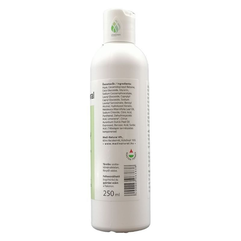 A megoldás a MediNatural teafaolaj sampon. A teafa sampon növényi eredetű hatóanyagai kíméletesen tisztítják és védik a hajat a környezetkárosító hatásoktól. Helyreállítják a fejbőr természetes egyensúlyát, és csökkentik a bakteriális eredetű korpásodást. A teafa sampon szabályozza a faggyútermelődést, rendszeres használatával a haj tiszta, ápolt, egészséges lesz.