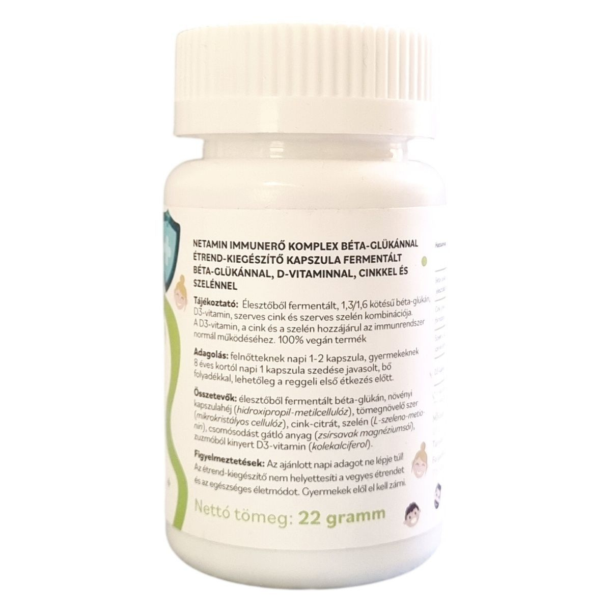 A Netamin Béta-Glükán Szinergia kapszula fermentált béta-glükánt, szerves cinket, szerves szelént és D-vitamint tartalmazhat, amelyek hozzájárulhatnak az immunrendszer normál működéséhez és a sejtek oxidatív stresszel szembeni védelméhez.
