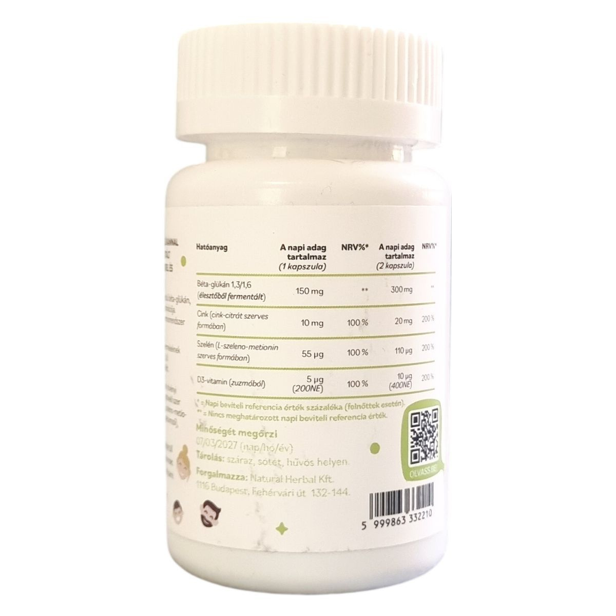 élesztőből fermentált béta-glükán, növényi kapszulahéj (hidroxipropil-metilcellulóz), mikrokristályos cellulóz, cink-citrát, szelén (L-szeleno-metionin), zsírsavak magnézium sói, zuzmóból kinyert D3-vitamin (kolekalciferol)