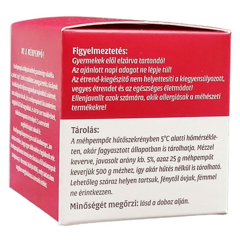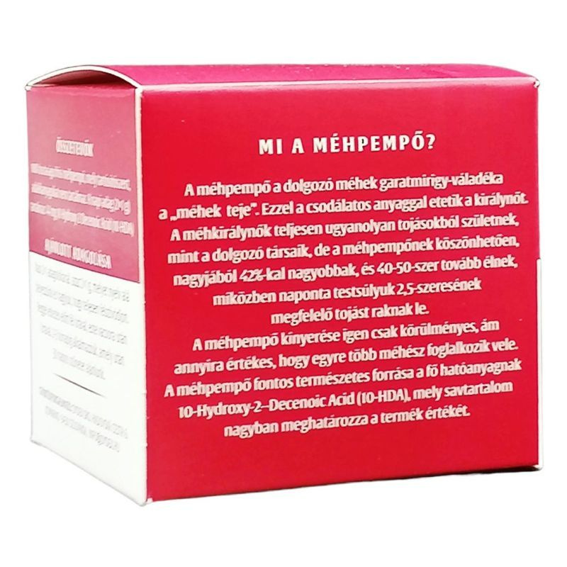 A méhpempő általános erősítő hatású táplálék-kiegészítő. Növeli a figyelem- és koncentrációkészséget, segíti a memóriát. Javítja az anyagcserét és étvágyfokozó hatása van. Kiegyenlíti vércukorszintet, hatékony ízületi fájdalmak esetén. Jótékony hatással van a légutakra és a nyálkahártyára, normalizálja a menstruációt, fokozza a termékenységet, ugyanakkor ajánljuk a változó korban lévő hölgyeknek is. A méhpempőben több mint húsz aminosav található. A magas arányú gamma-globulin tartalmának köszönhetően kitűnő immunrendszer-erősítő. Adagolása testsúlytól függően 2x1 gramm. A kúra tartalma két-három hónap, melyek között 30 napos szünet ajánlott.