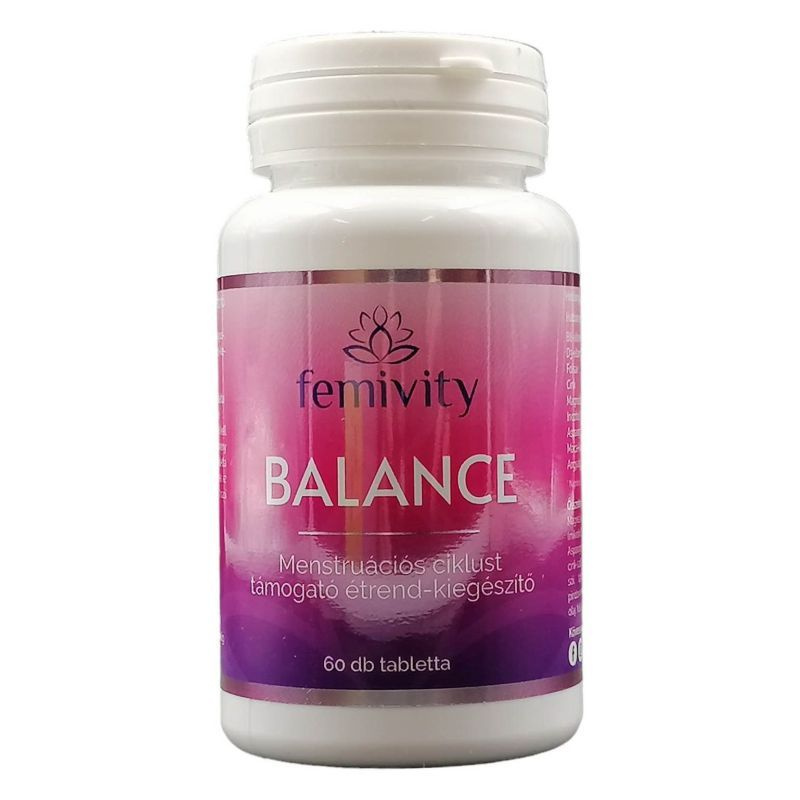 MIÉRT VÁLASZD A FEMIVITY BALANCE-T? A femivity Balance étrend-kiegészítő tablettát speciálisan nőknek fejlesztettük ki a hormonháztartás támogatásáért a menstruációs ciklus során. A stressz, a helytelen táplálkozás, a fogamzásgátlók szedése, valamint a kozmetikumokban és a környezetünben megtalálható vegyi anyagok felboríthatják a nők hormonális egyensúlyát. A femivity Balance segíthet fenntartani a jó közérzetet és a testi-lelki egyensúlyt a női ciklus alatt. Segíthet enyhíteni a PMS (premenstruációs szindróma) tüneteit, például a fej- és hátfájást, a hasi görcsöket, a felfúvódást és a keringési problémákat.