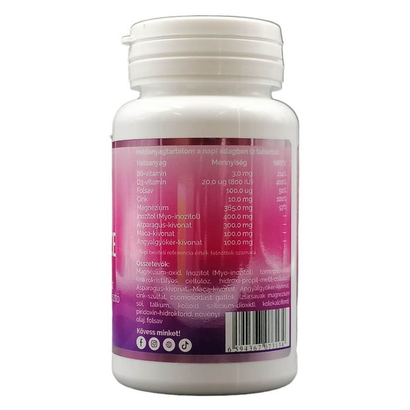 HATÓANYAGOK A TERMÉK NAPI ADAGJÁBAN (2 TABLETTA): B6-vitamin: 3,0 mg 214%, D3-vitamin: 20,0 μg 400%, folsav: 100,0 μg 50%, cink: 10,0 mg 100%, magnézium: 365,0 mg 97%, inozitol (myo-inozitol): 400,0 mg, asparagus-kivonat: 300,0 mg, maca-kivonat: 100,0 mg, angyalgyökér-kivonat: 100,0 mg.