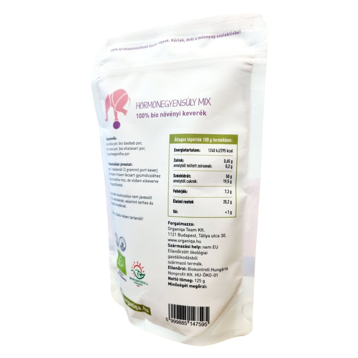 A HORMONEGYENSÚLY MIX egy 100% bio növényi keverék, amely öt különböző növényi port tartalmaz: cékla, baobab, maca, shatavari és ashwagandha. Ezek az összetevők hozzájárulhatnak a hormonális egyensúly támogatásához. A termék nem javasolt 12 év alattiaknak, terhes és szoptató anyáknak. A keveréket napi 1 teáskanál mennyiségben ajánlott fogyasztani, gyümölcsléhez vagy smoothie-hoz keverve. A termék 100% újrahasznosítható tasakban érkezik, és ellenőrzött ökológiai gazdálkodásból származik. Az energia- és tápérték adatok alapján a keverék alacsony zsírtartalmú, de gazdag élelmi rostokban.
