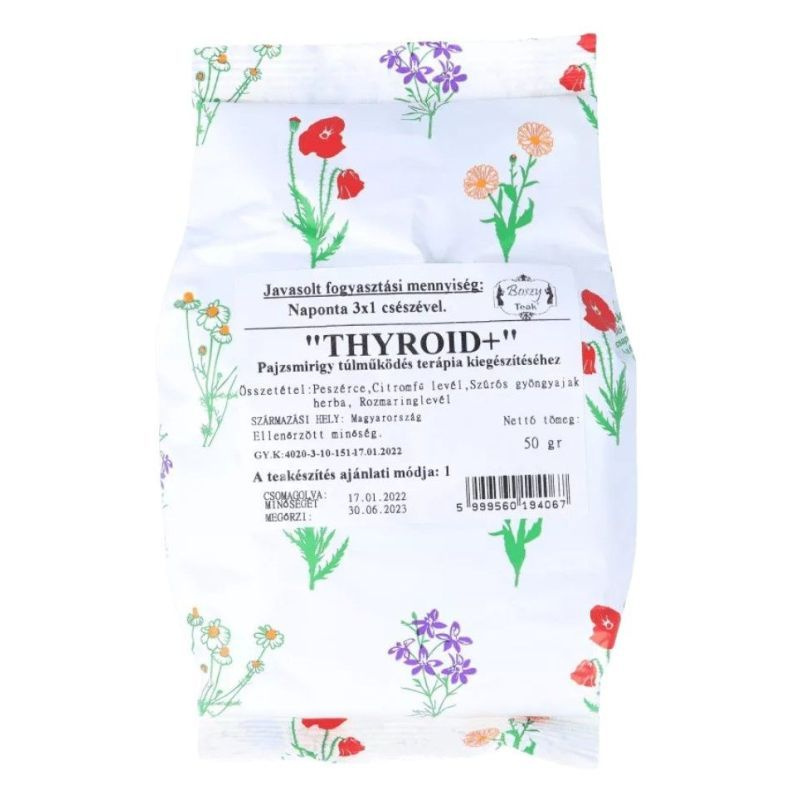 Természetes összetevői segítenek a tünetek enyhítésében, a pajzsmirigy normál működésének helyreállításában. A Thyroid+ tea gyógynövény összetevői sokoldalú élettani-és gyógyhatással rendelkeznek. Pajzsmirigy túlműködés terápia kiegészítéséhez.