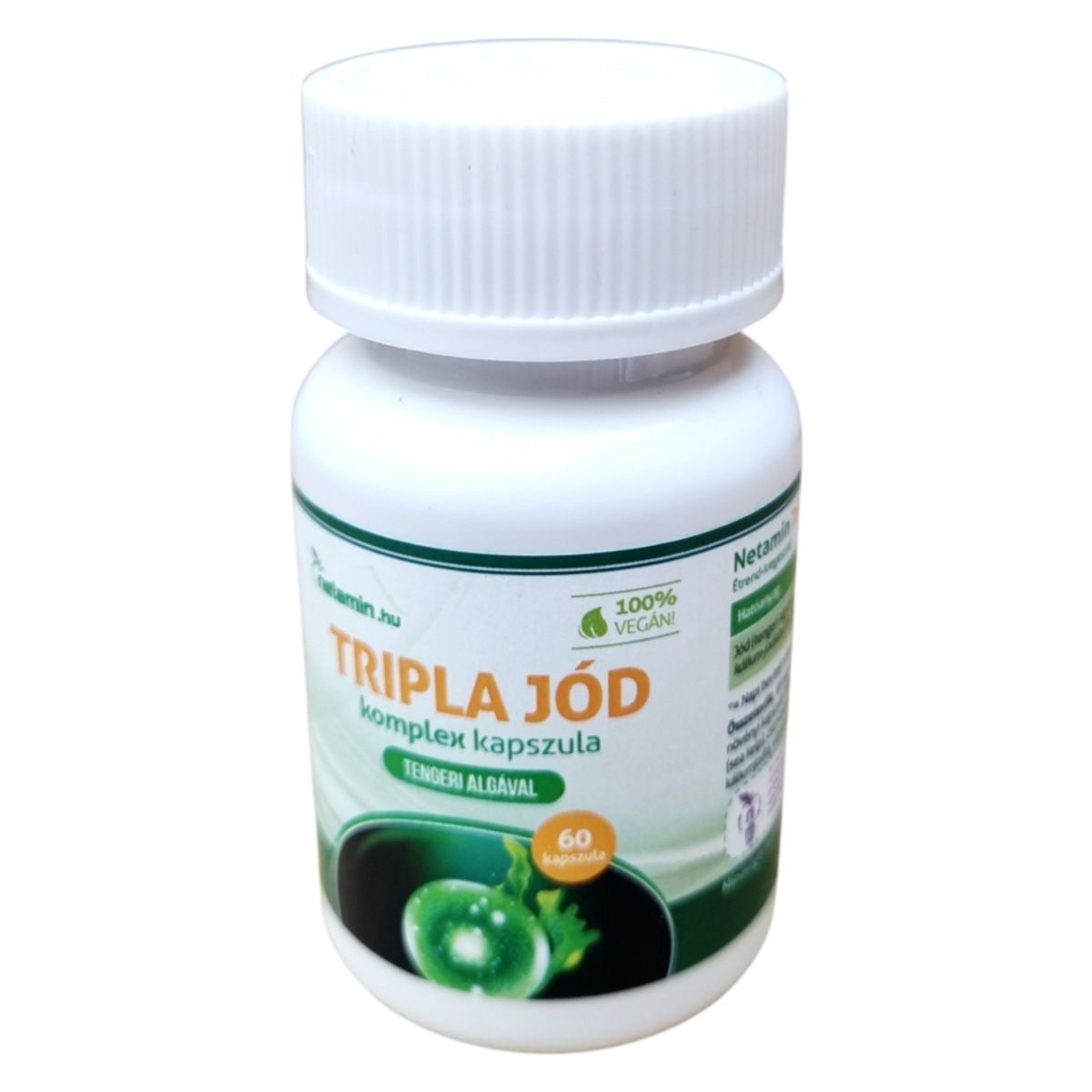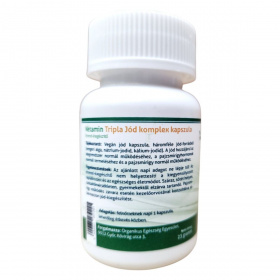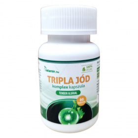 A Netamin Tripla Jód komplex kapszula egy vegán étrend-kiegészítő, amely háromféle jód-forrást tartalmazhat: tengeri alga, nátrium-jodid és kálium-jodid. A jód hozzájárulhat az idegrendszer normál működéséhez, valamint a pajzsmirigyhormonok normál termeléséhez és a pajzsmirigy normál működéséhez. A termék 60 kapszulát tartalmaz, és felnőttek számára napi 1 kapszula fogyasztása ajánlott, lehetőleg étkezés közben. Fontos, hogy az ajánlott napi adagot ne lépje túl, és a termék nem helyettesíti a kiegyensúlyozott vegyes étrendet és az egészséges életmódot. Tárolása száraz, sötét helyen, szobahőmérsékleten, gyermekektől elzárva javasolt.