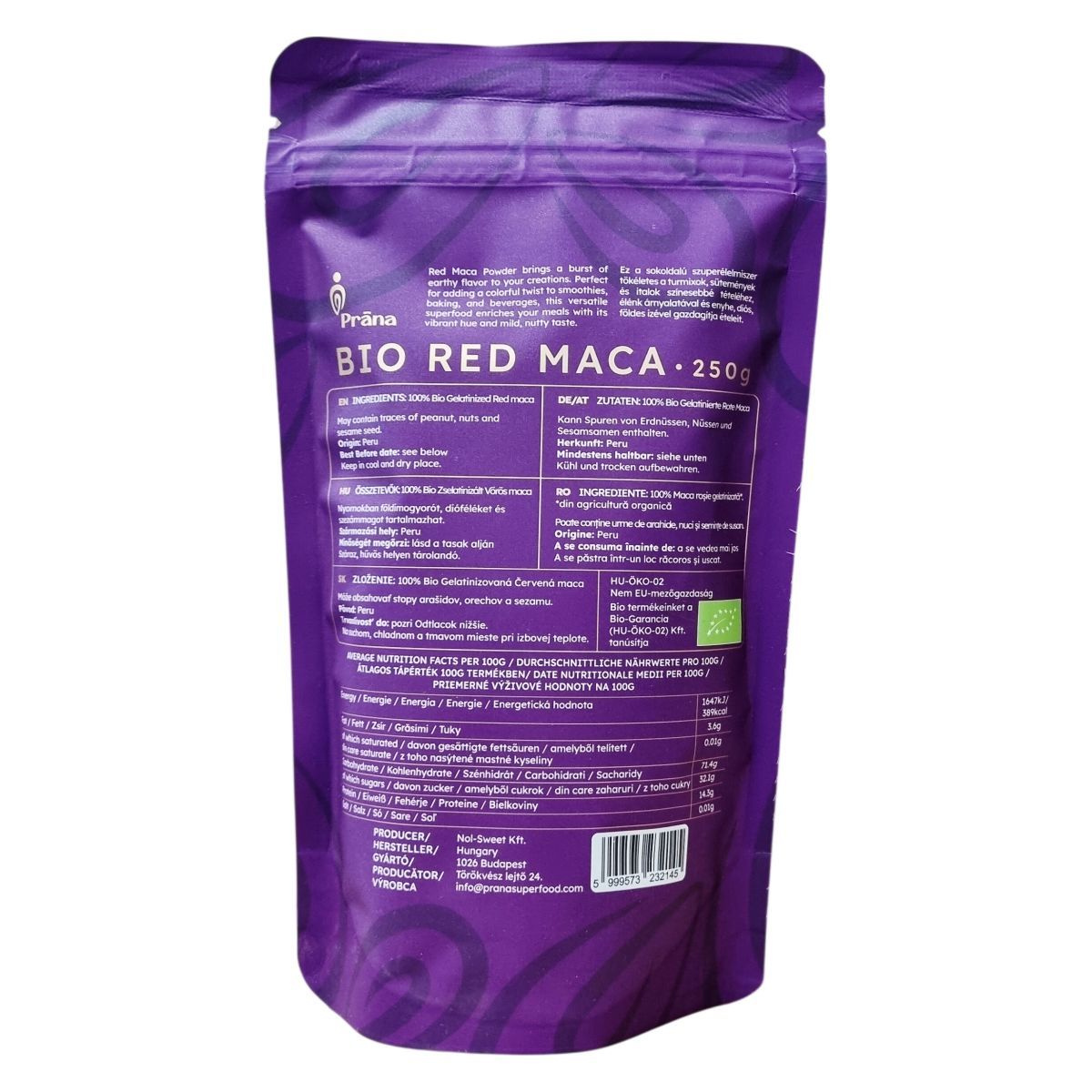 A Bio Red Maca főként Peruból származó zselatinizált vörös maca por, amely egy sokoldalúan felhasználható szuperélelmiszer. Jellegzetes földes és enyhén diós ízének köszönhetően turmixok, sütemények és italok ízvilágát gazdagíthatja, élénk színével pedig színesebbé teheti ezeket. A termék bio minősítésű, vegán és gluténmentes, azonban előállítása során nyomokban előfordulhat földimogyoró, diófélék és szezámmag jelenléte. Az energia- és tápérték-adatok alapján számos tápanyagot tartalmaz, így hozzájárulhat a szervezet természetes támogatásához. A por felhasználásával változatos és tápláló étel- és italreceptek készíthetők.