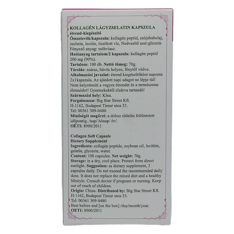 A kollagén felelős a bőr és a bőr alatti szövetek rugalmasságáért, feszességéért, a csontok, haj, bőr állapotáért. , Hiánya esetén fáradság kimerültség ízületi problémák jelentkezhetnek. Alkalmazási javaslat: naponta 2 kapszula javasolt étkezés után vagy közben. Összetevők: kollagénpeptid, szójababolaj, zselatin, lecitin, tisztított víz. Nedvesítő szer: glicerin. Fényező anyag: méhviasz. Hatóanyag-tartalom/2 kapszula: kollagénpeptid 200 mg.