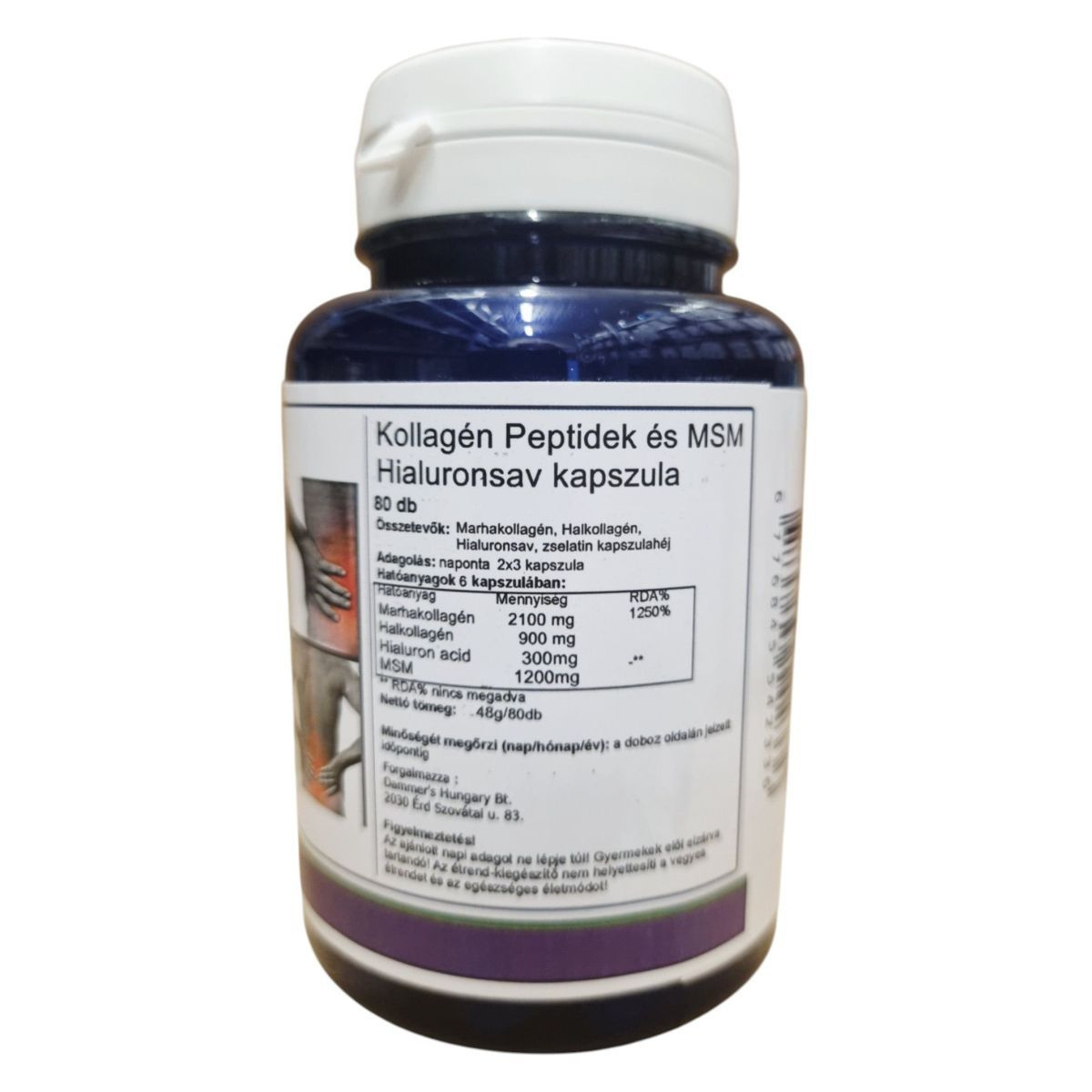 A DAMMER'S Collagen Peptides Hyaluron kapszula marhakollagént, halkollagént, hialuronsavat és MSM-et tartalmazhat, amelyek hozzájárulhatnak a bőr, ízületek és kötőszövetek egészségének támogatásához.