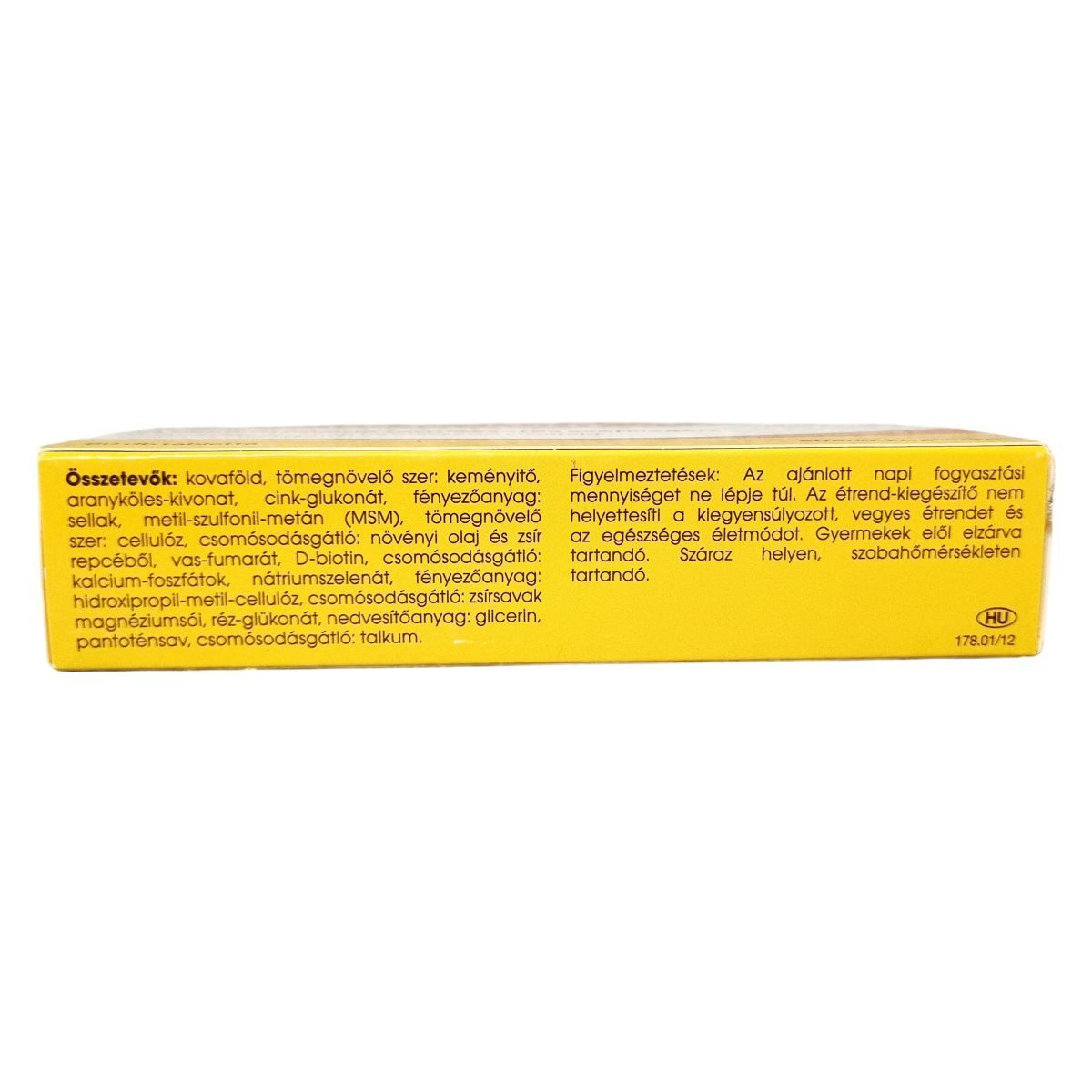kovaföld, keményítő, aranyköles-kivonat, cink-glukonát, sellak, metil-szulfonil-metán (MSM), cellulóz, növényi olaj és zsír repceből, vas-fumarát, D-biotin, kalcium-foszfátok, nátrium-szelenát, hidroxipropil-metil-cellulóz, zsírsavak magnéziumsói, réz-glükonát, glicerin, pantoténsav, talkum