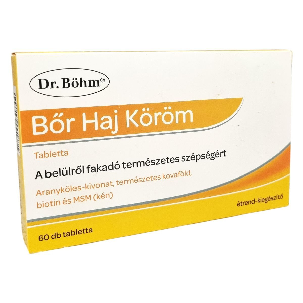 Dr. Böhm® Bőr Haj Köröm tabletta egy olyan étrend-kiegészítő, amelynek célja a bőr, a haj és a köröm egészségének támogatása. Az egyedülálló összetétel aranyköles-kivonatot és természetes kovaföldet tartalmaz, amelyek természetes szilíciumforrásként szolgálnak. A biotin hozzájárulhat az egészséges bőr megőrzéséhez, míg a szelén az egészséges haj fenntartásához, a réz pedig a haj normál pigmentációjához. A cink hozzájárulhat a köröm egészségéhez. A tabletták emellett metil-szulfonil-metánt (MSM) is tartalmaznak, amely kénforrás lehet. Az étrend-kiegészítő formában található vitaminok és ásványi anyagok napi adagja biztosítani tudja a szervezet számára szükséges tápanyagokat. A termék laktóz- és gluténmentes, így széles körben alkalmazható. A megfelelő hatás elérése érdekében ajánlott legalább három hónapon keresztül naponta kétszer bevenni egy tablettát, majd igény szerint folytatni a szedést.