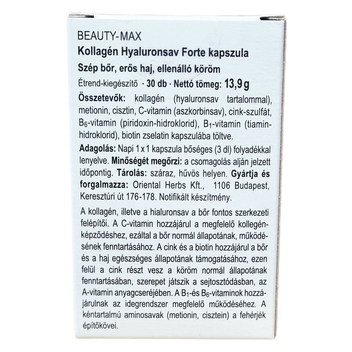 A kollagén és a hialuronsav a bőr fontos szerkezeti felépítői lehetnek. A C-vitamin hozzájárulhat a megfelelő kollagénképződéshez, amely elősegítheti a bőr normál állapotának fenntartását. A cink és a biotin hozzájárulhat a bőr és a haj egészséges állapotának támogatásához, emellett a cink részt vehet a köröm normál állapotának megőrzésében, és szerepet játszhat a sejtosztódásban valamint az A-vitamin anyagcseréjében. A B1- és B6-vitamin hozzájárulhat az idegrendszer megfelelő működéséhez. A kéntartalmú aminosavak, a metionin és a cisztin a fehérjék építőkövei lehetnek. A termék megbízható minőségben, helyes gyártási gyakorlat szerint készül, hogy megfeleljen a minőségi előírásoknak, és már több mint 30 éve jelen van a fogyasztók bizalmában.