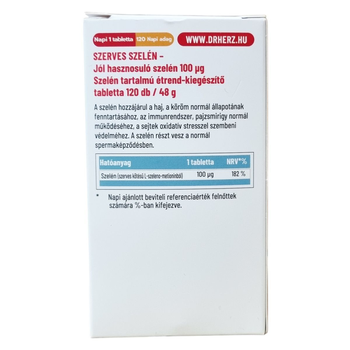 A Dr.Herz Szerves Szelén étrend-kiegészítő tabletta 100 µg szerves kötésű L-szeleno-metionint tartalmaz, amely jól hasznosulhat a szervezetben. A szelén hozzájárulhat a haj és köröm normál állapotának fenntartásához, az immunrendszer és a pajzsmirigy normál működéséhez, valamint a sejtek oxidatív stresszel szembeni védelméhez. Emellett szerepet játszhat a normál spermaképződésben is. A termék 120 darabos kiszerelésben, napi egy tabletta fogyasztásával ajánlott.