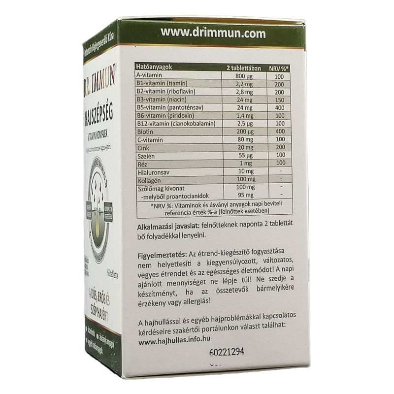 A biotin, cink, szelén hozzájárul a haj, míg a niacin, biotin, cink és B2-vitamin pedig a bőr normál állapotának fenntartásához. Adagolás: napi 2 tabletta.