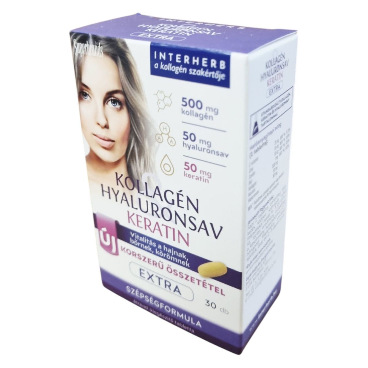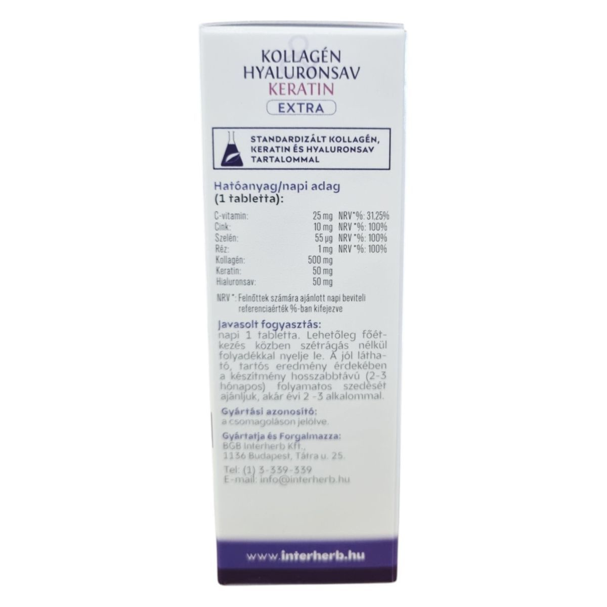 Az INTERHERB Kollagén&Hyaluronsav&Keratin Extra étrend-kiegészítő tabletta megújult, korszerű összetételével a haj, a bőr és a köröm egészségének, szépségének megőrzésére lett kifejlesztve. A kollagén, keratin és hyaluronsav tartalommal rendelkező formula hozzájárulhat a bőr struktúrájának, hidratáltságának fenntartásához, valamint a hajszövet felépítéséhez. A C-vitamin, cink, szelén és réz szerves vegyületek formájában támogatják a haj, bőr és köröm normál állapotát. A termék hidrolizált kollagén kivonatot tartalmaz, amely szarvasmarha eredetű, valamint hidrolizált keratint, amely birka eredetű. Az Acerolából kivont természetes C-vitamin hozzájárulhat a megfelelő kollagén képződéséhez.