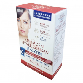 Az INTERHERB Kollagén Hyaluronsav Elasztin Forte tabletta kollagénnel, hyaluronsavval és elasztinnal gazdagított készítmény, amely hozzájárulhat a bőr egészségének és szépségének megőrzéséhez. A termék retinolt és C-vitamint is tartalmazhat, amelyek támogathatják a bőr szerkezetét és hidratáltságát.