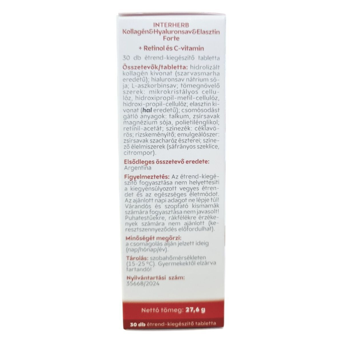 Az INTERHERB Kollagén Hyaluronsav Elasztin Forte tabletta egy korszerű, megemelt hatóanyag-tartalmú készítmény, amelyet a bőr egészségének és szépségének megőrzésére ajánlanak, különösen a 40+ korosztály számára. A termék kollagént, elasztint és hyaluronsavat tartalmaz, amelyek a bőr vázanyagaként fontos szerepet játszhatnak a bőr szerkezetének és hidratáltságának fenntartásában. A C-vitamin hozzájárulhat a megfelelő kollagén képződéshez, míg az A-vitamin a bőr és a nyálkahártyák egészségének megőrzésében játszhat szerepet. Az összetevők között található hidrolizált kollagén kivonat szarvasmarha eredetű, és a termék elsődleges összetevője Argentínából származik.